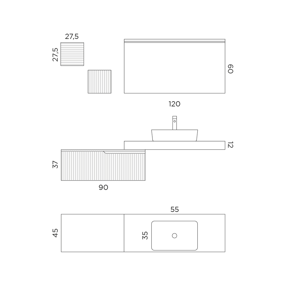 • Base with 1 drawer: Length 90 cm x Depth 45 cm x Height 37 cm
