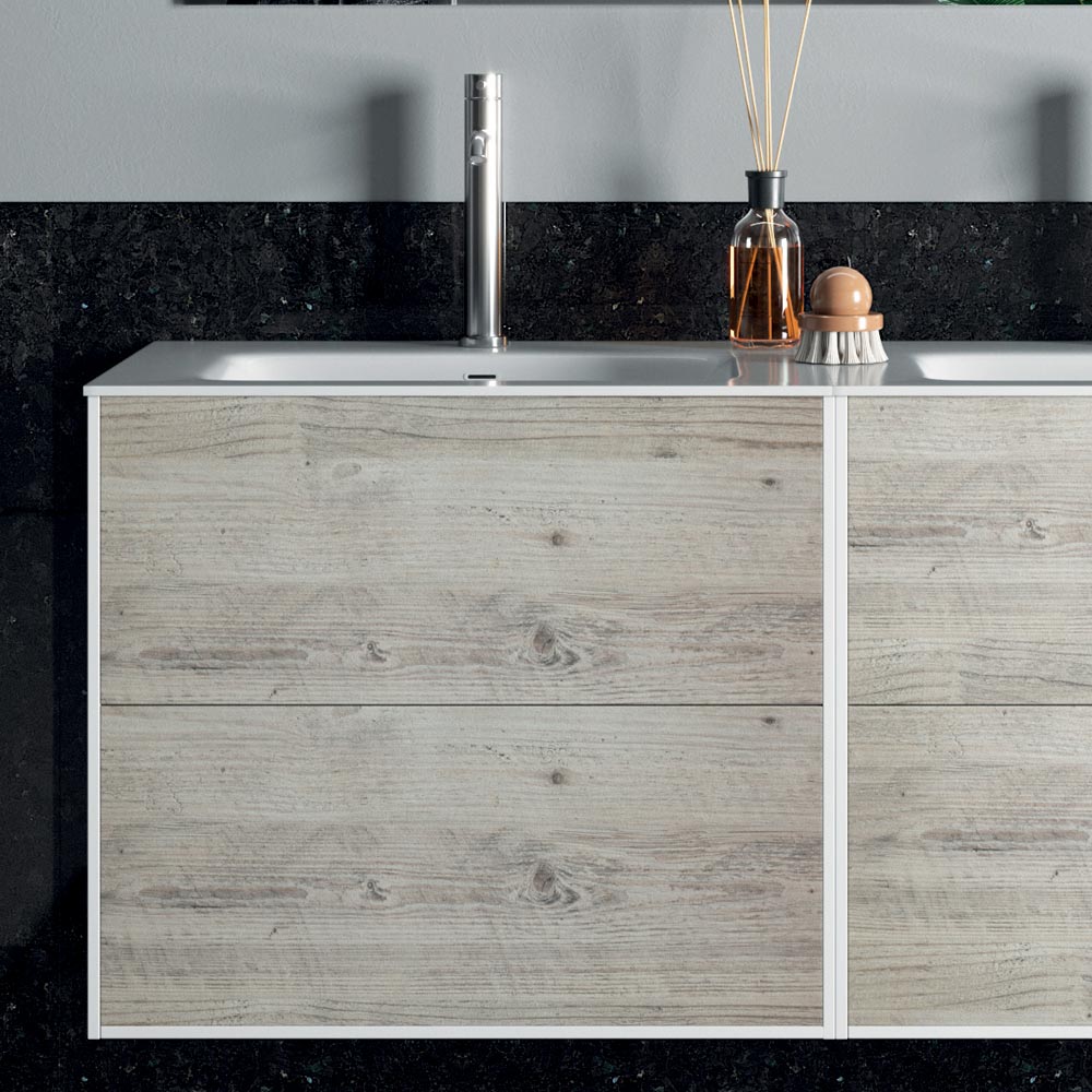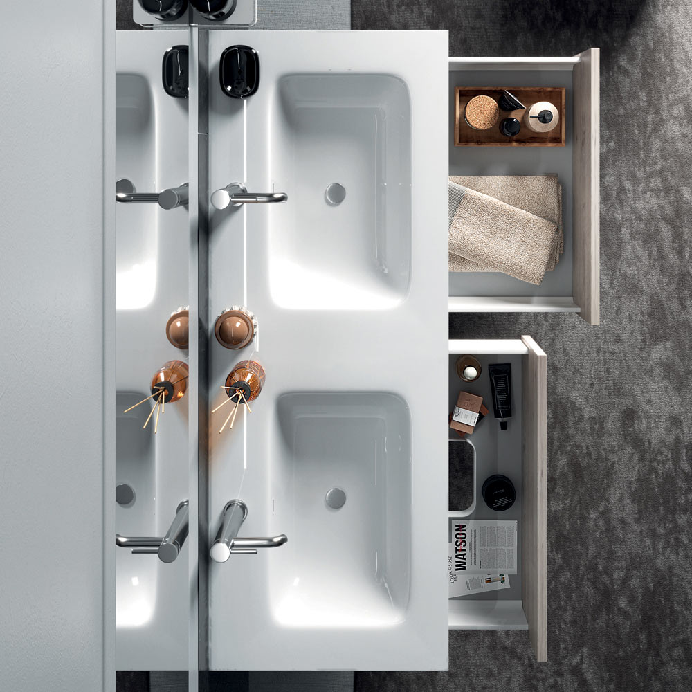 Bathroom composition complete with double ceramic sink , rectangular mirror with single front LED light Ā  and base in arctic pine-coloured scratch-resistant melamine with 4 drawers with total opening and soft close closure.