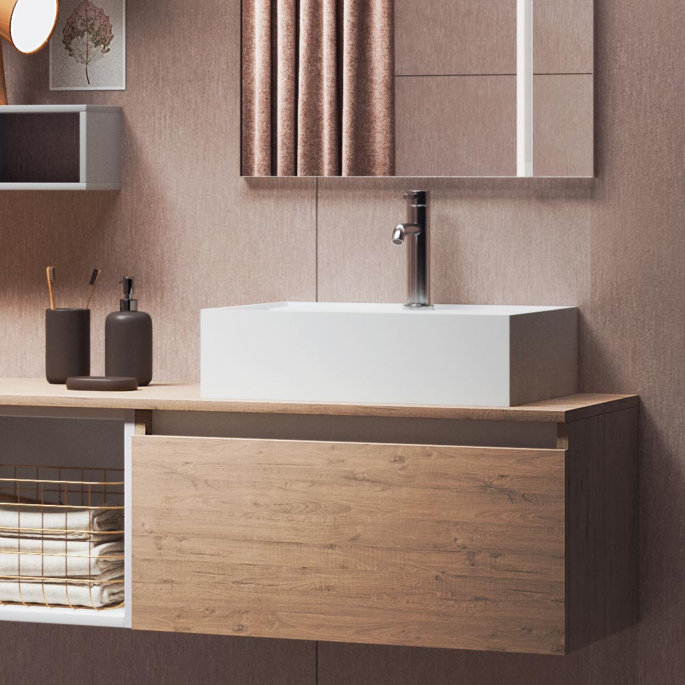 Decisive and clean queues come together in this combination of products to give the bathroom a refined and elegant style. You do not give up functionality and practicality thanks to the storage compartment and the convenient drawer and the materials chosen for its construction.