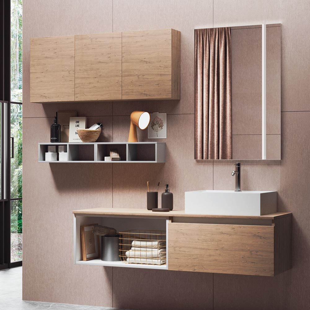 Bathroom composition with white ceramic countertop washbasin , mirror with ABS frame with front LED, suspended base in scratch-resistant melamine with honey oak finish Ā with fully extractable drawer and soft close closure and glossy white open wall unit .