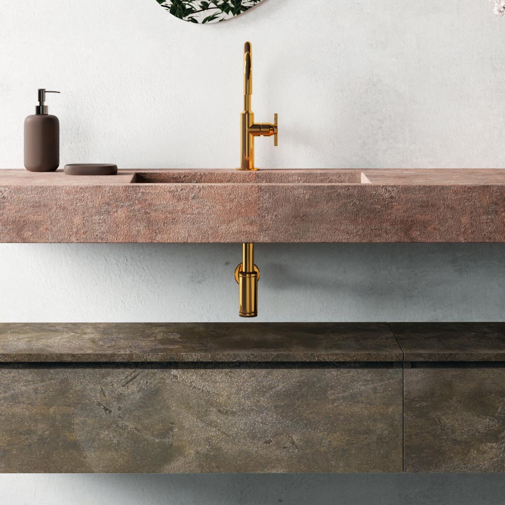 Bathroom composition consisting of a modern style mirror and corten-coloured console sink lava stone colored base.