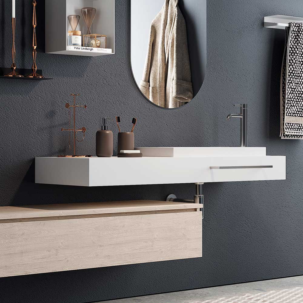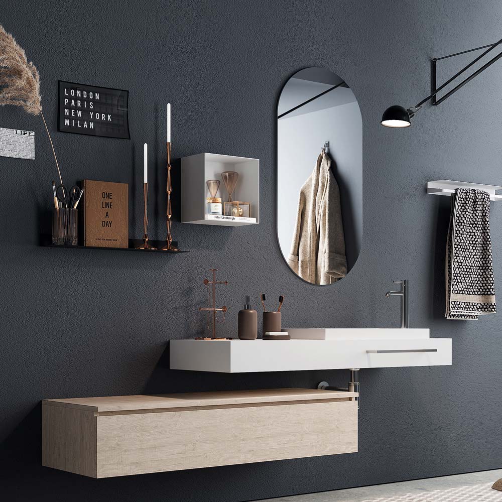 Bathroom composition with a modern and minimal style that meets the needs of all those who want to furnish their bathroom with taste and refinement. The combination of materials and colours make these products unique and guarantee the quality and resistance that characterise all bathroom furniture.