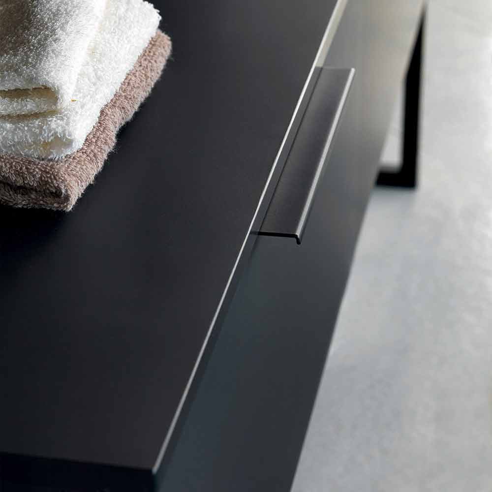The vanity unit includes two drawers in matt black fenix and is supported by support feet in matt black metal.