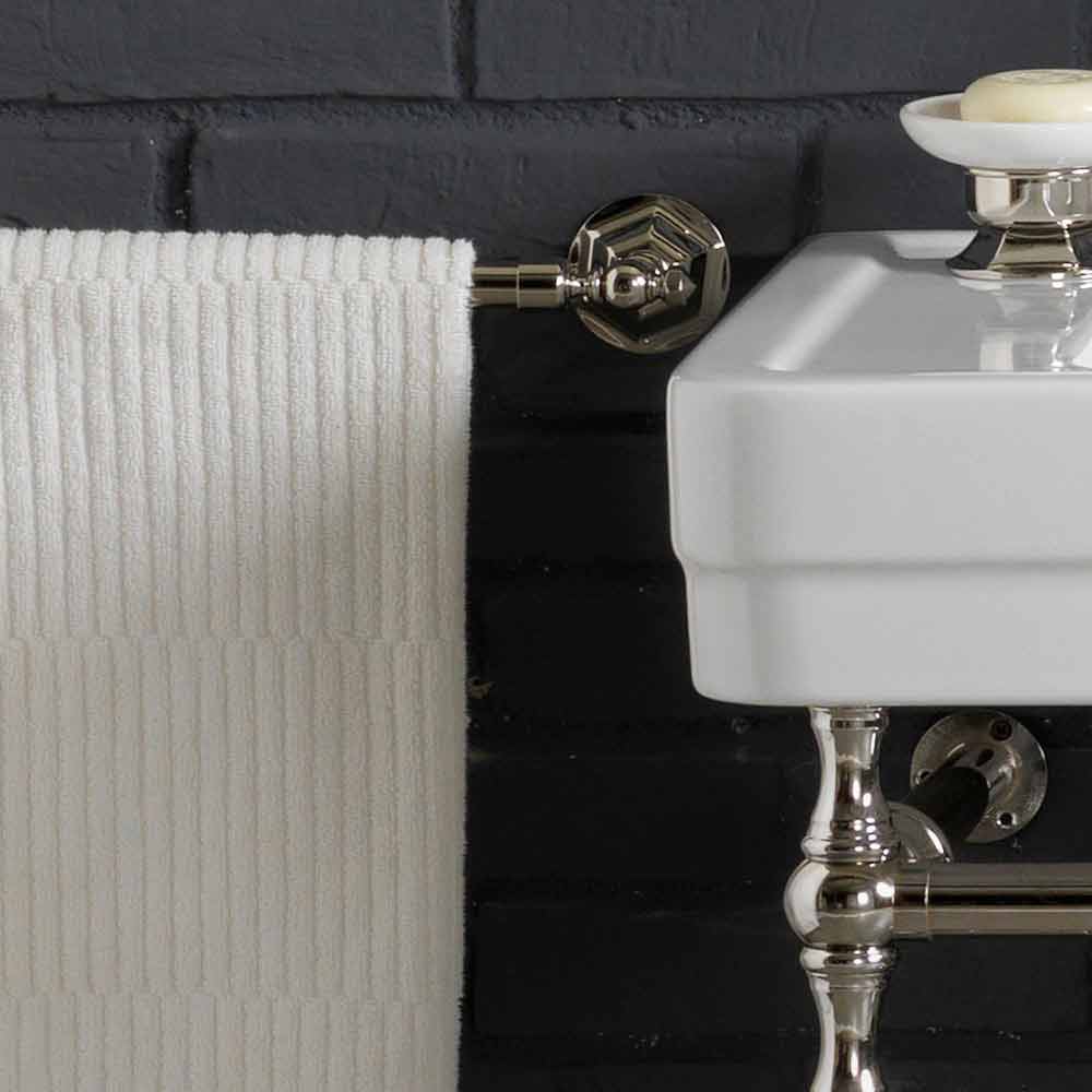 Parts included in the composition: - White ceramic washbasin. Measurements: L.130 cm x D. 51 cm - Metal base + base grid. Polished nickel finish L.130 cm x h. 76 + 13 cm x 51 cm wall overhang - 2 bridge taps together with chain - 2 siphons - 2 drains - 2 tilting rectangular mirrors with brass metal frame in polished nickel finish. Measurements: 76.5cm x 57.5cm. - Free standing toothbrush holder - Countertop ceramic soap holder