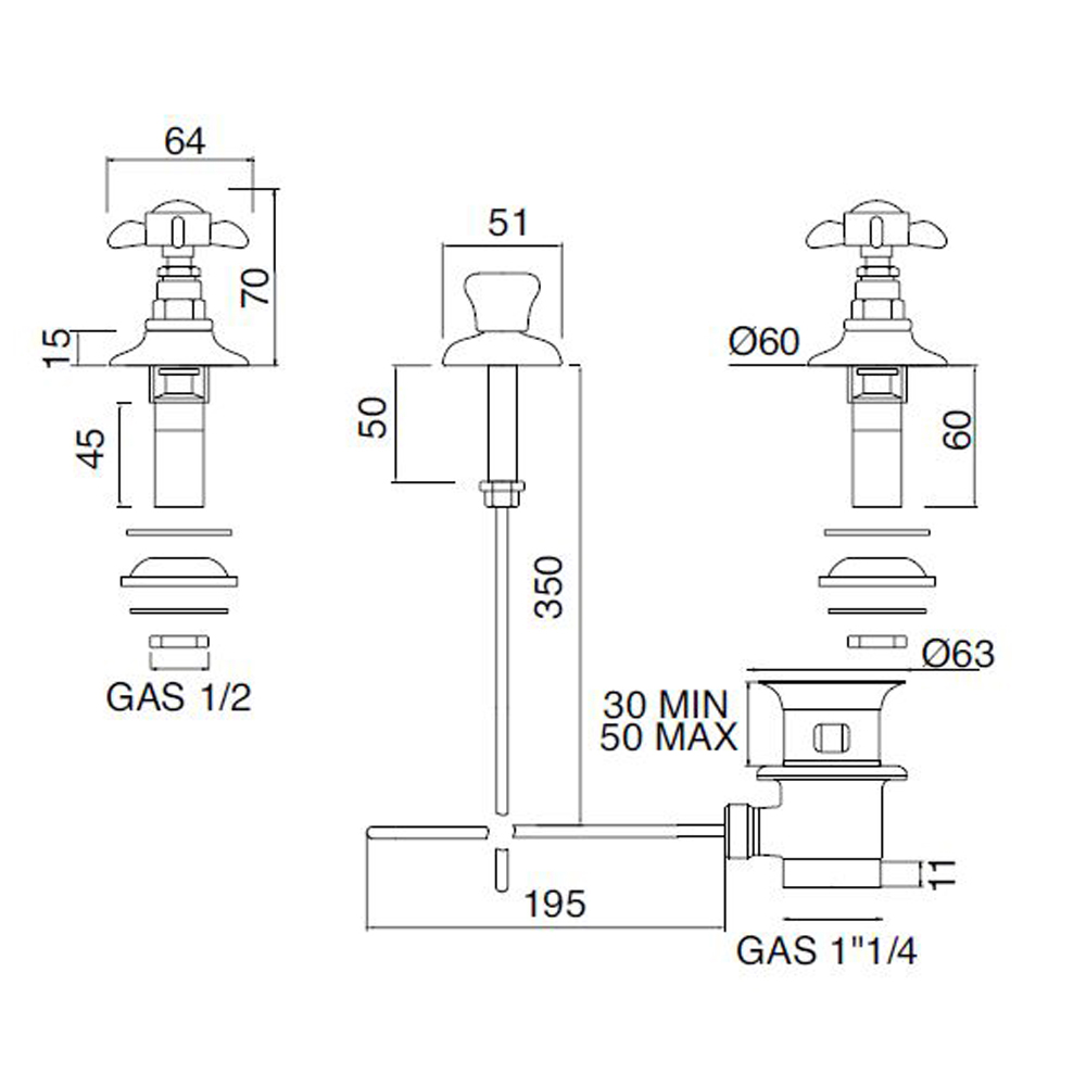 Bidet tap 3-hole internal supply in handcrafted brass and classic style made in Italy.