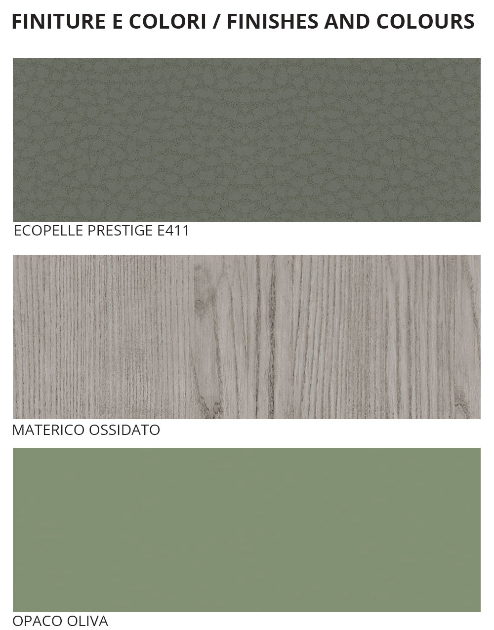 headboard covered in eco-leather , one-drawer bedside table and 4-drawer chest of drawers (composed of 4 modular elements) in oxidized and matt lacquered wood with olive finish,