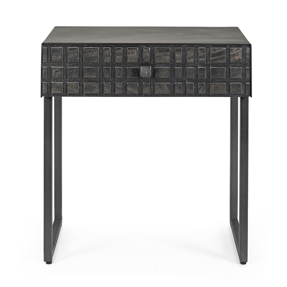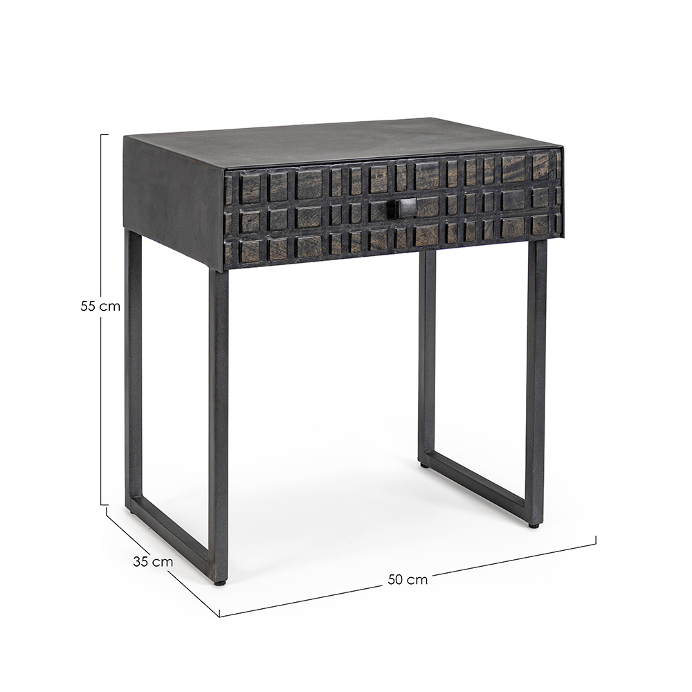 Bedside table in steel with drawer in mango wood of ethnic design.
