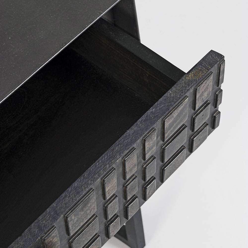 The drawer and the door are made of mango wood with a nitrocellulose-based finish.