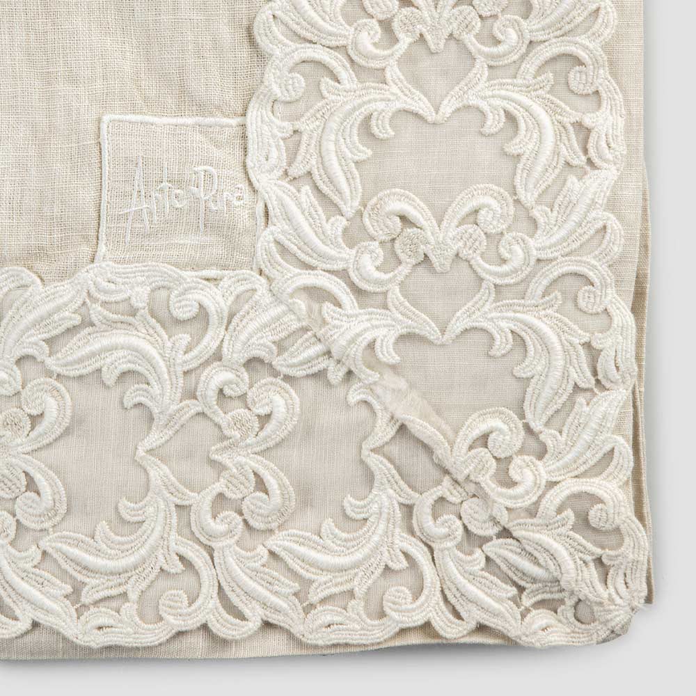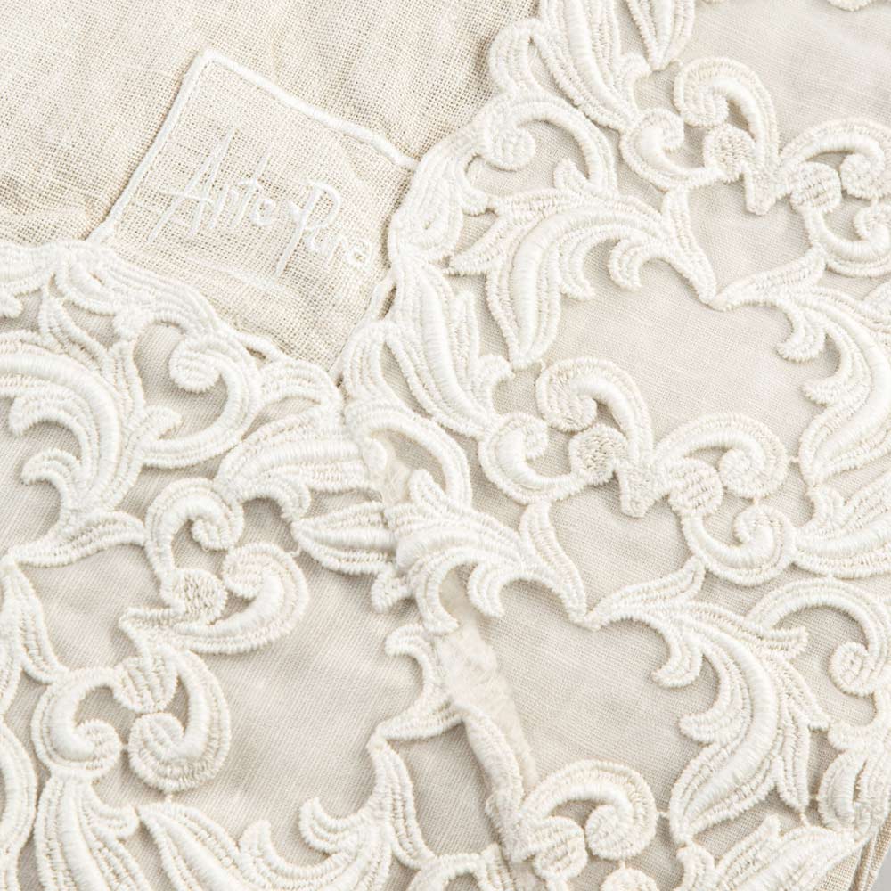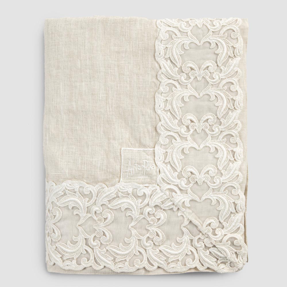 linen tablecloth embellished with Farnese lace. Made in Italy with high quality materials and made soft to the touch thanks to special treatments that enhance the natural appearance. Ideal for the table as it is apoallergenic and antibacterial, in addition to the use of natural and