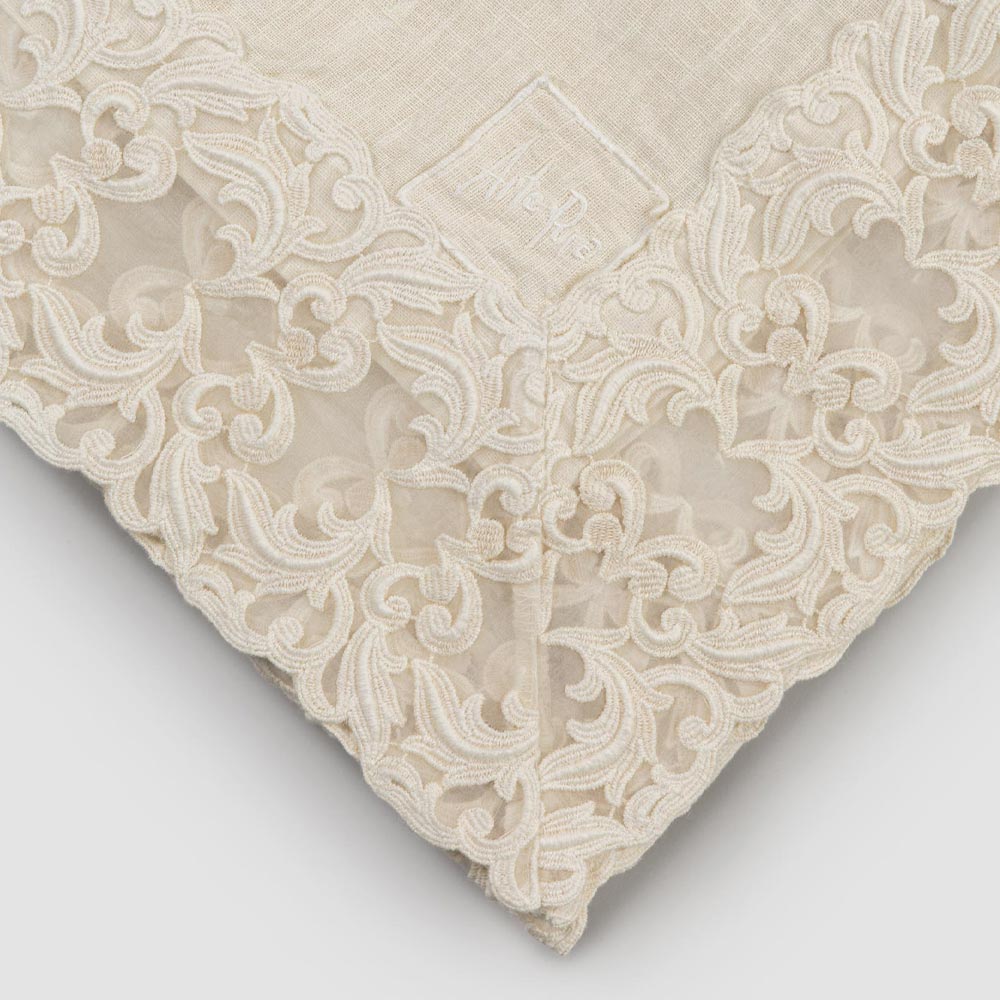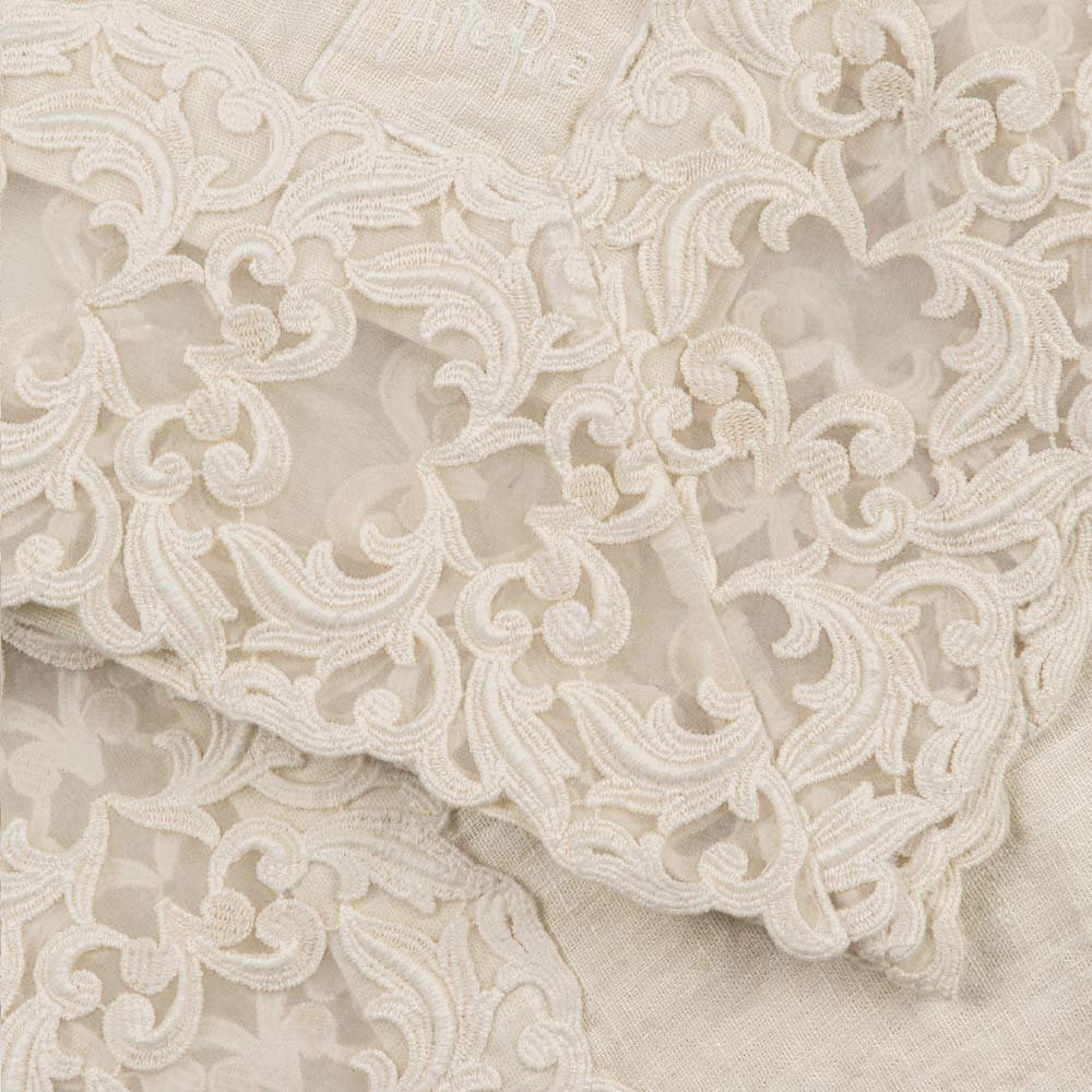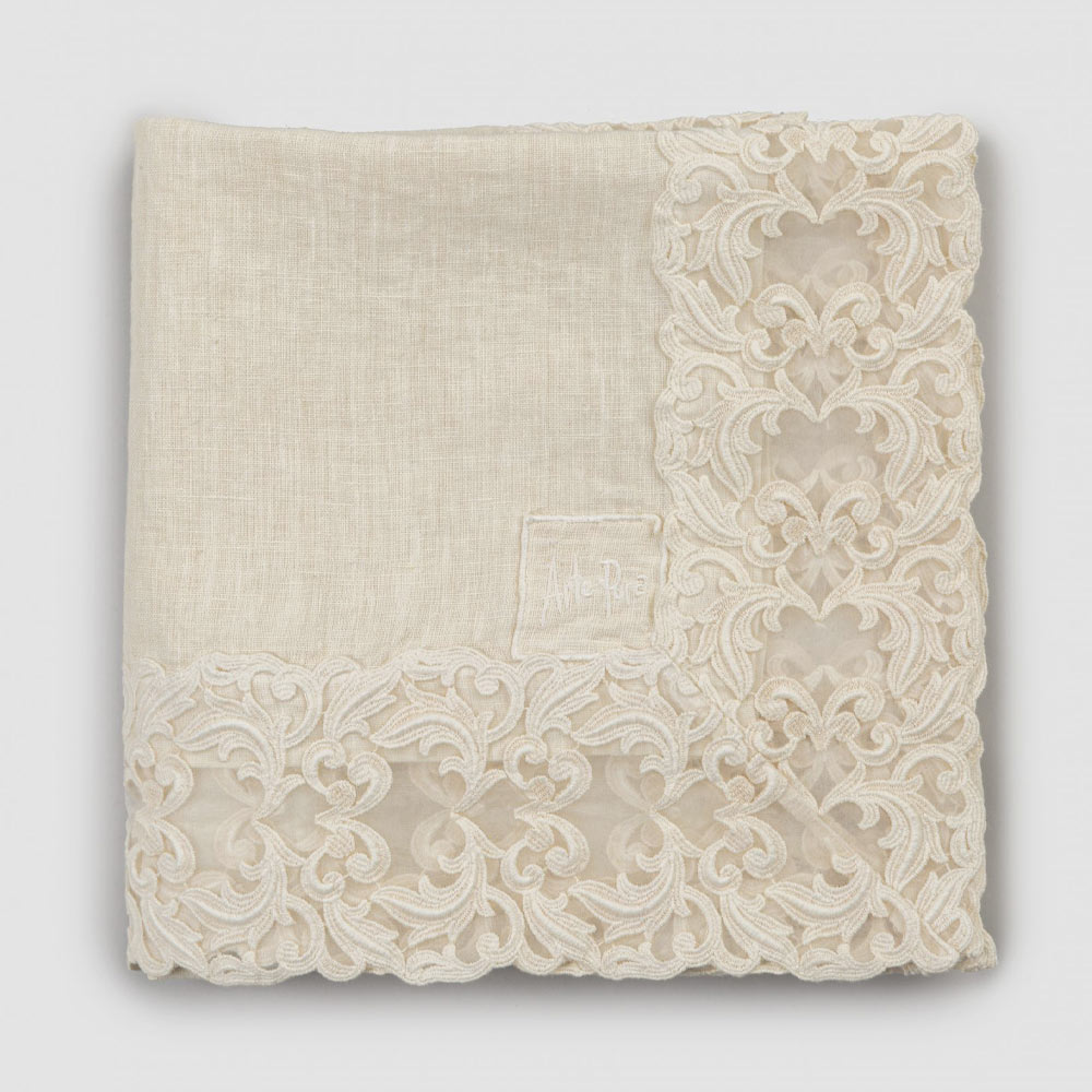 linen tablecloth embellished with Farnese lace. Made in Italy with high quality materials and made soft to the touch thanks to special treatments that enhance the natural appearance. Ideal for the table as it is apoallergenic and antibacterial, in addition to the use of natural and
