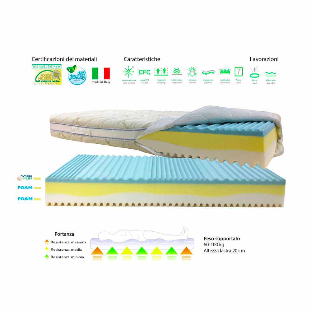 In fact, the body rests first on the slab with specially worked Viscopur memory , then on soft polyurethane foam with ergonomic shape and finally on the supporting slab of high density polyurethane foam to give the right support.