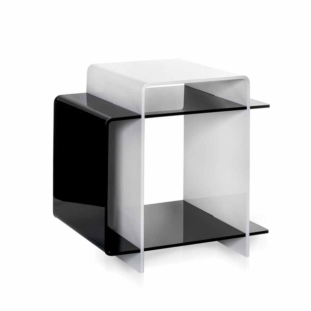 Gosto is made of 100% PMMA plexiglass from virgin polymers and it has 3 functional shelves. It can be used both as a coffee table or a bedside table. Its design is inspired by the geometries and bicolour of the '70s. Laser cut and bent at high temperatures. Self supporting.