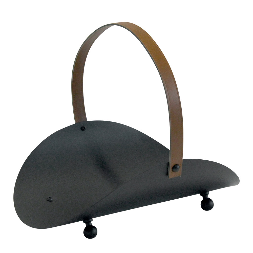 This fireplace log holder is a functional design object that embodies elegance in its purest form. Crafted with a sturdy metal body and finished in a classic black tone, it is accented with a leather handle that adds a touch of rustic sophistication.