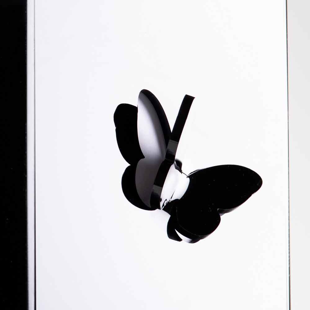 The umbrella stand in black plexiglass is characterized by the representation of laser-marked winter branches and three-dimensional decorated butterflies and stainless steel base.