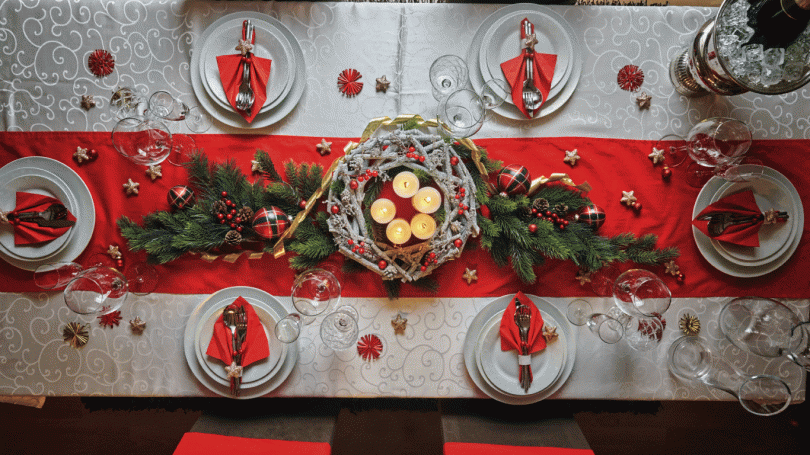 Christmas Table - Set with Themed Tablecloths, Plates and Glasses - Advices