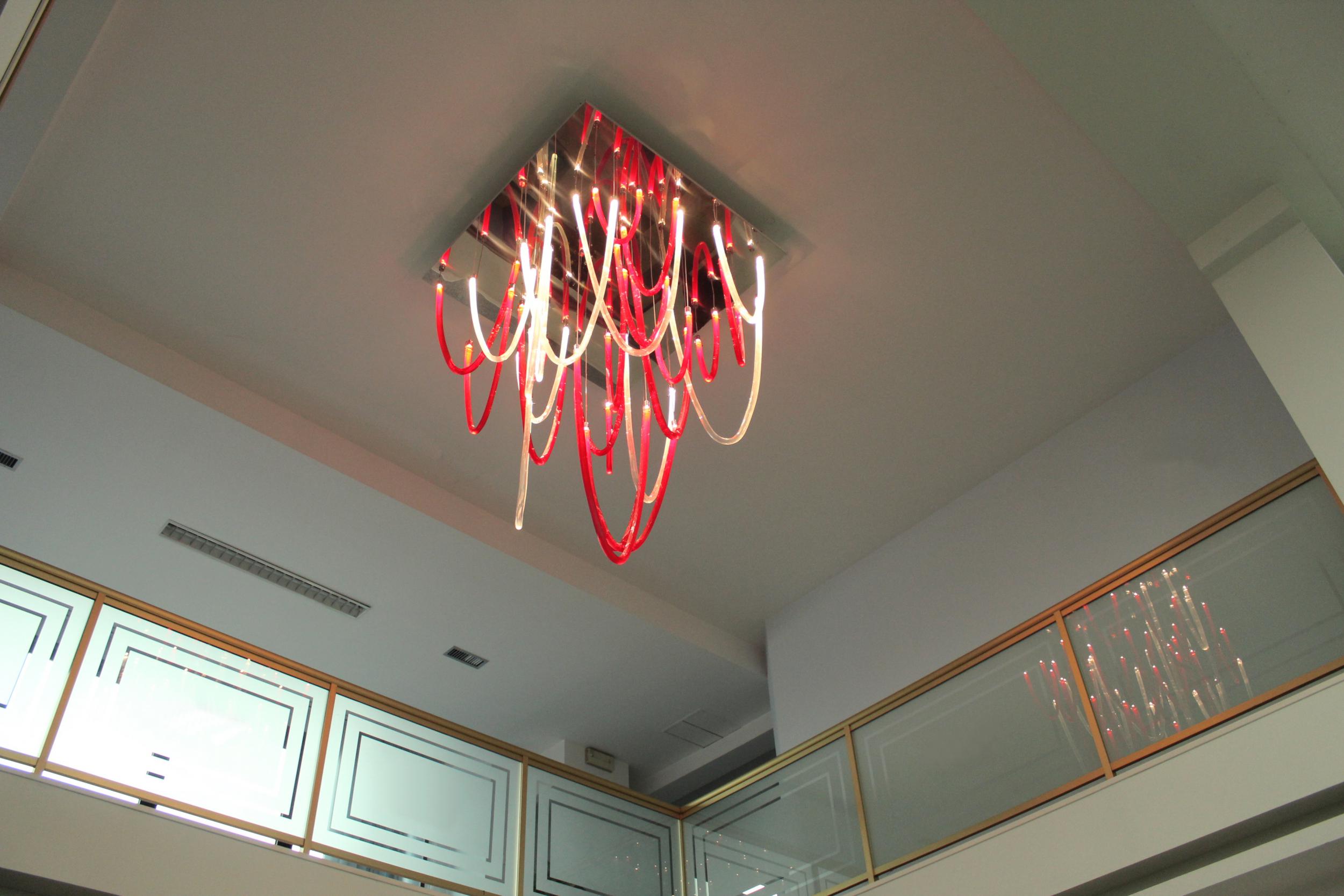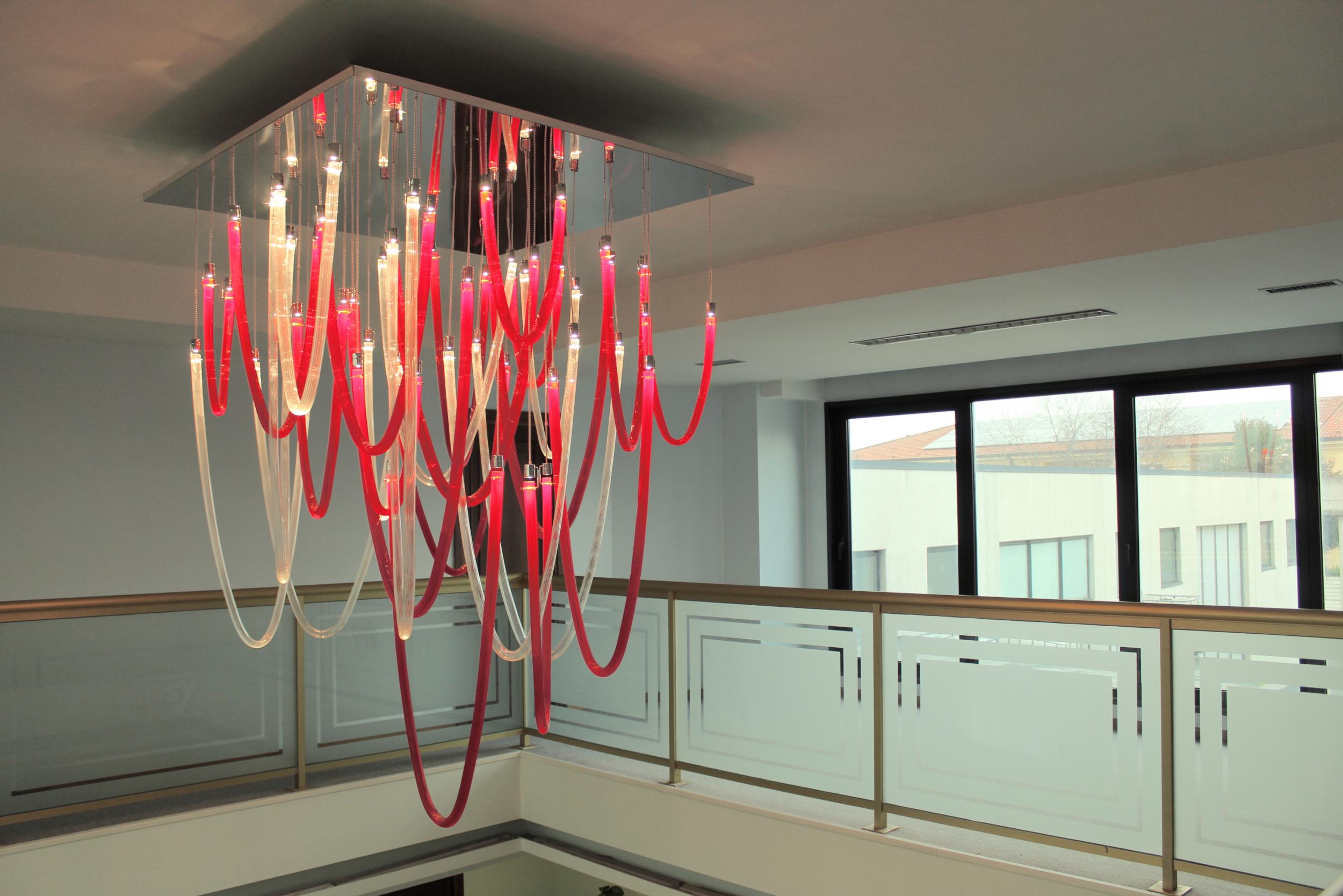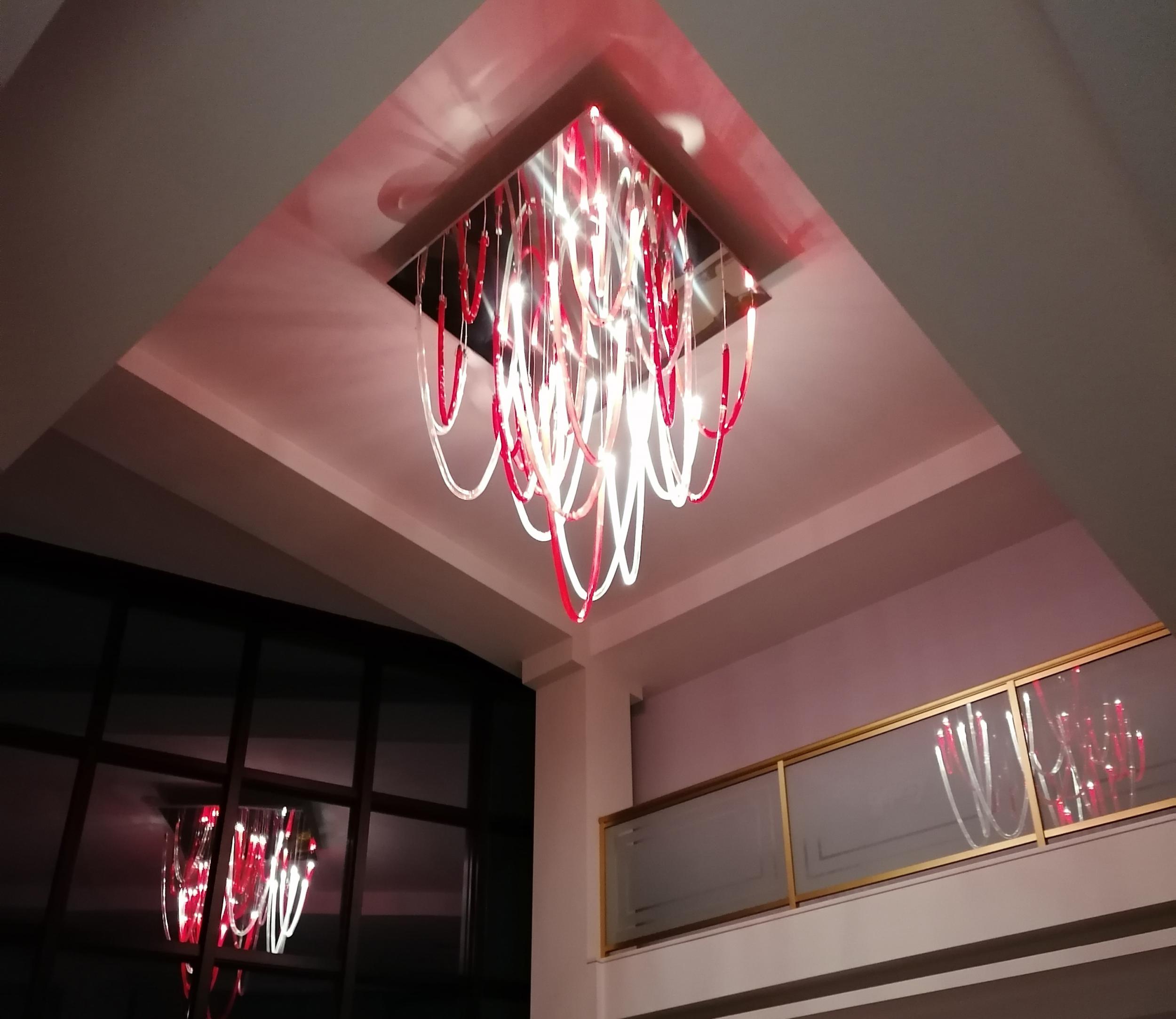 Majestic and elegant, it has a square base with a 140cm side, from which the blown glass elements with thin ribs illuminated by LEDs gently descend. The total height of the chandelier is 220 cm. Elegant and welcoming is the light that these LEDs spread through the red and transparent glass that makes up the entire chandelier we have chosen. But remember that this lamp also lends itself to customizations in colors and sizes.