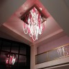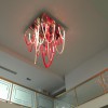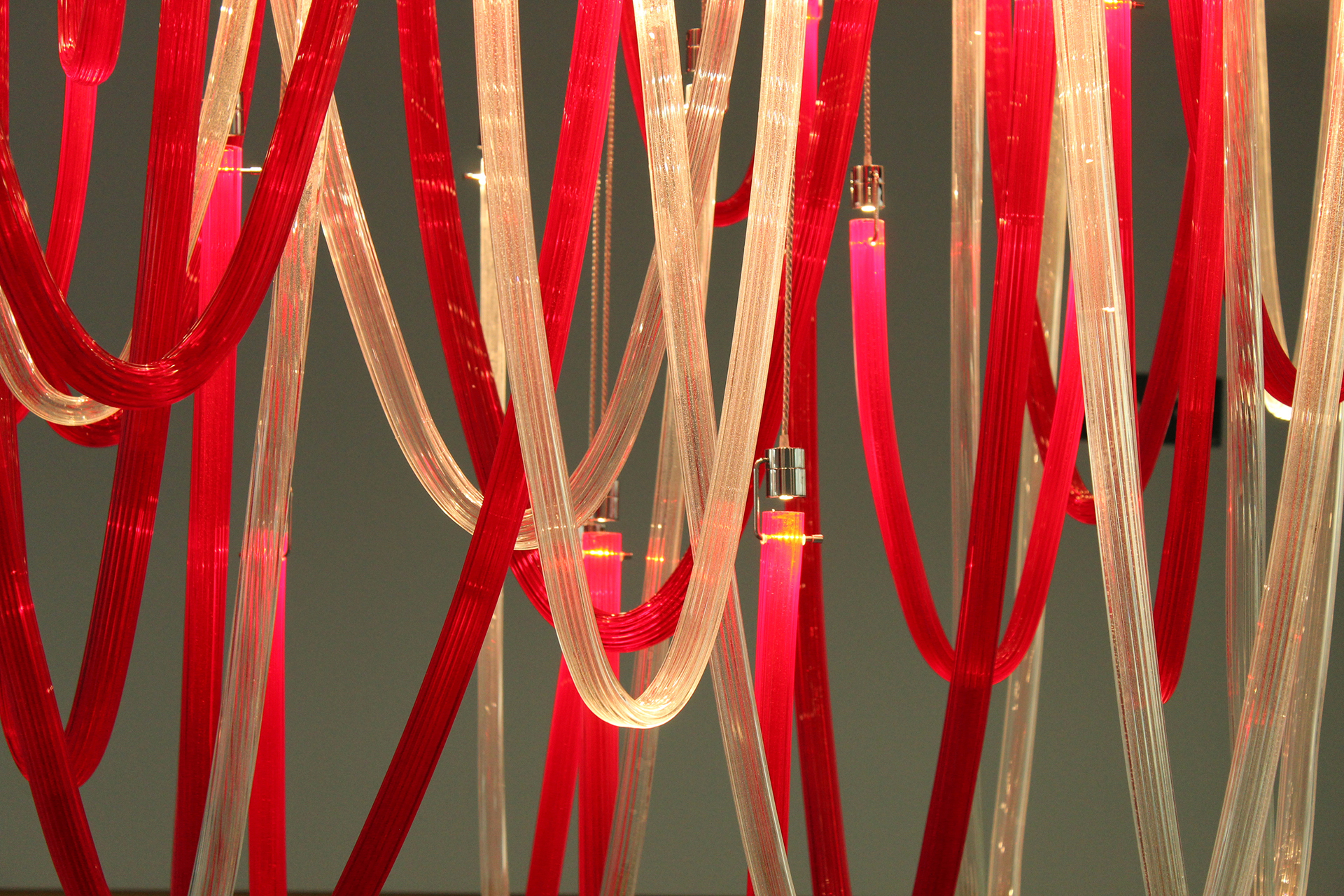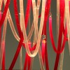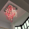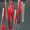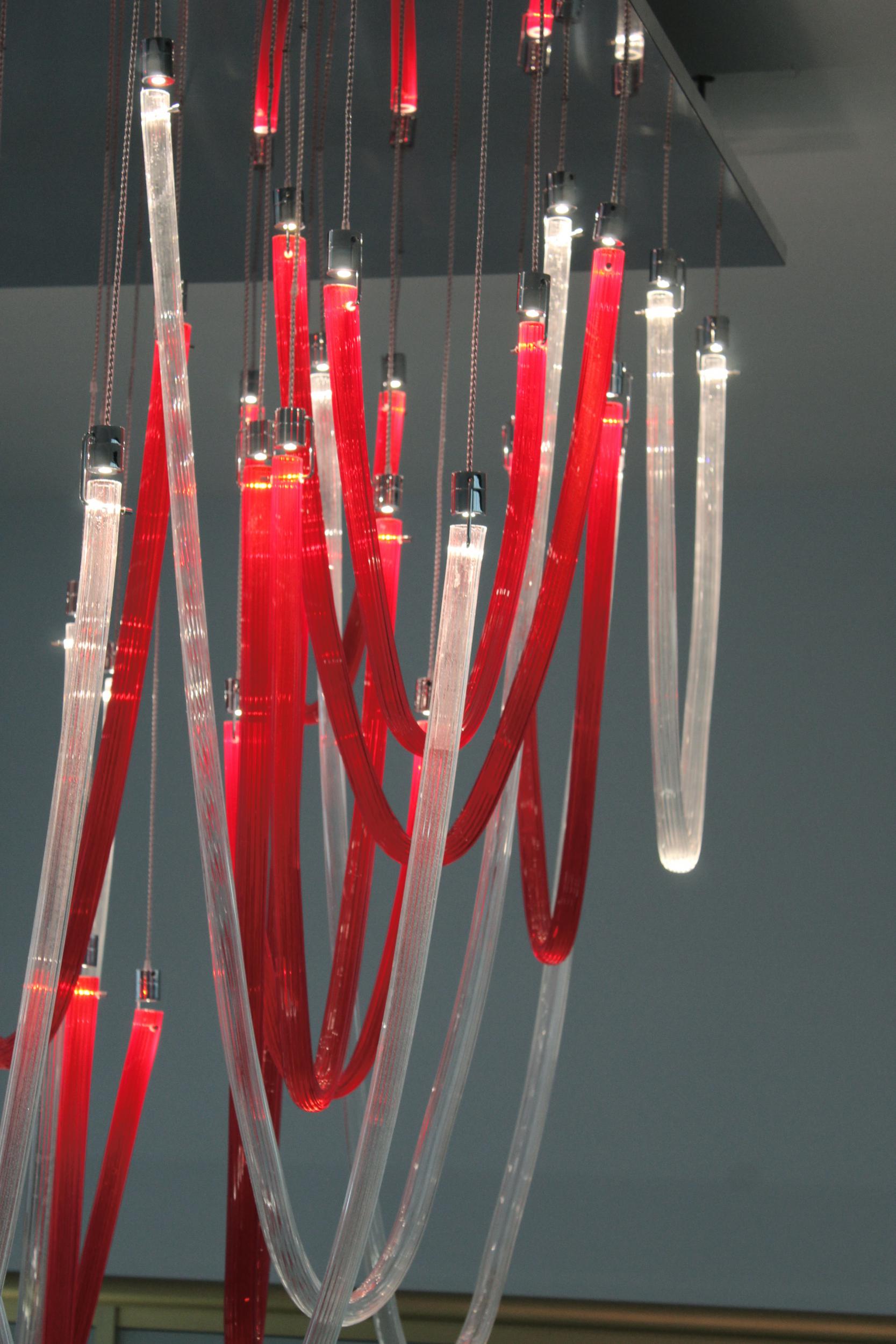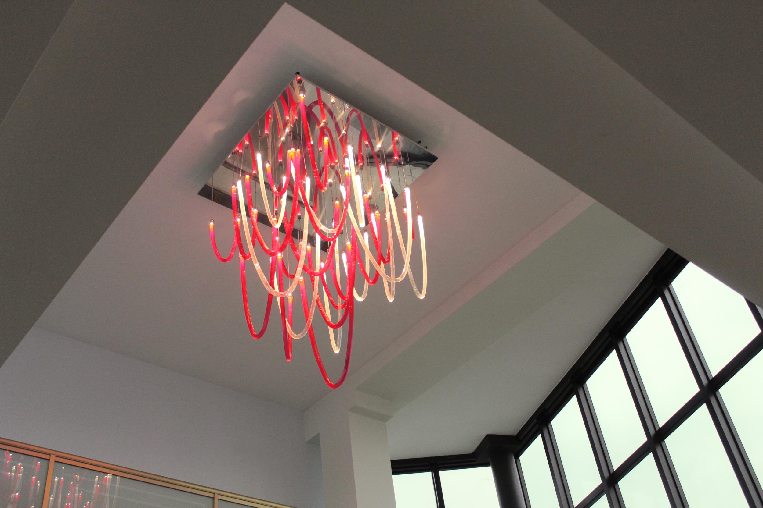 Majestic and elegant, it has a square base with a 140cm side, from which the blown glass elements with thin ribs illuminated by LEDs gently descend. The total height of the chandelier is 220 cm. Elegant and welcoming is the light that these LEDs spread through the red and transparent glass that makes up the entire chandelier we have chosen. But remember that this lamp also lends itself to customizations in colors and sizes.