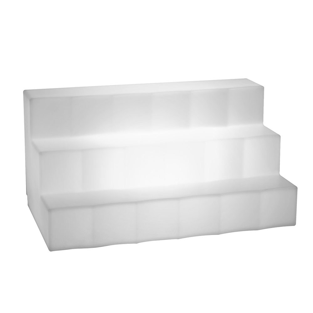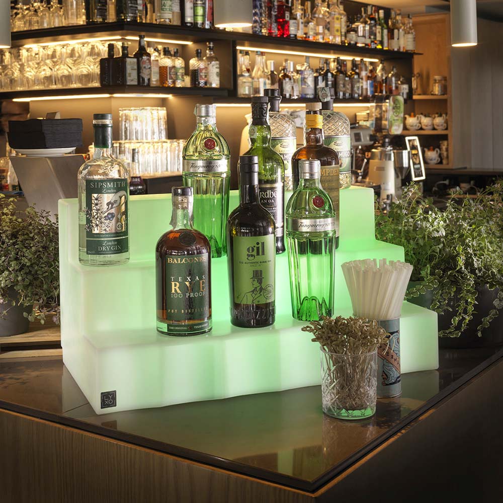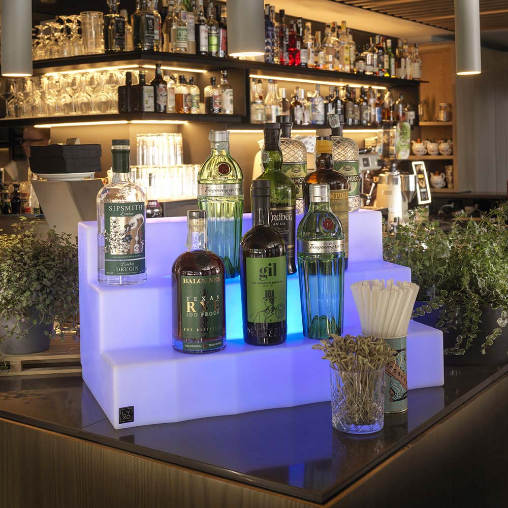 Marvy bottle display in polyethylene composed of three large steps that allow you to accommodate various types of bottles in order to make the bar area elegant and modern with a touch of classic Italian design . Display that lights up with the option of White LED or RGBW LED light, at your discretion. A solution with a great visual impact, aesthetically appealing but also functional.