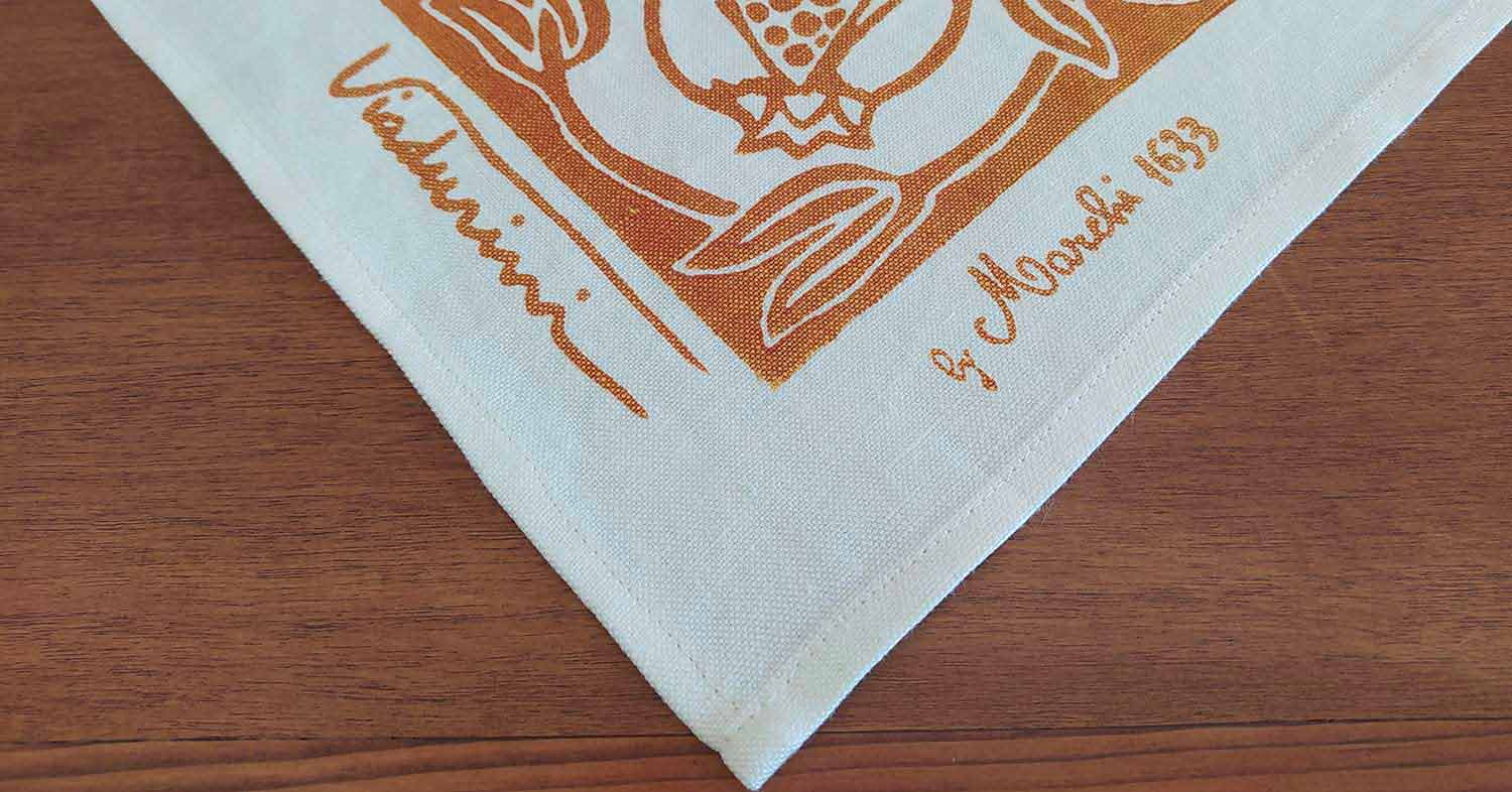 - 3 possible prints available: Blue, with ancient Pomegranate design, a symbol of abundance and prosperity; Rust, with ancient traditional drawing of Uccellino pecking grapes; Rust, with ancient design of the Malatesta love knot (an Italian feudal family that marks the history of the territory), a symbol of their indissoluble bond.