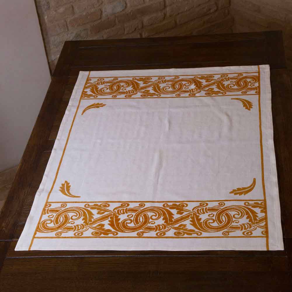 Artisan set for breakfast (placemat and 2 napkins) made of pure linen with artistic print on hand-decorated antique fabrics, available in three variants, a unique piece of quality made in Italy.