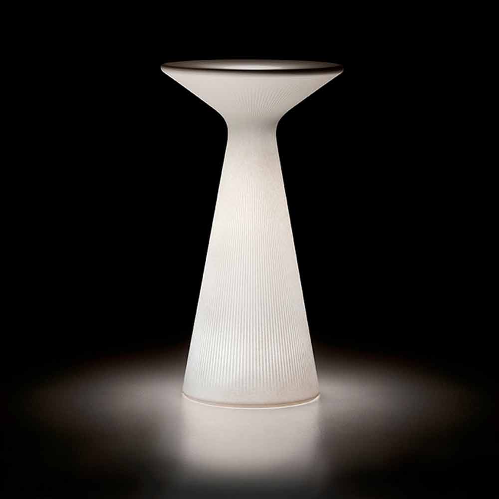 Round outdoor coffee table, made in Italy with white polyethylene structure characterized by the particular striped surface that covers the entire base, creating original plays of light and shadow. Together with this feature, what makes the design of this product unique and particularly interesting is the RGB LED light that creates modern and captivating atmospheres ideal for wonderful evenings with chinas in domestic outdoor spaces such as gardens or terraces but also contract environments in which furnish in a unique and creative way without neglecting the fundamental functional aspect of the product.