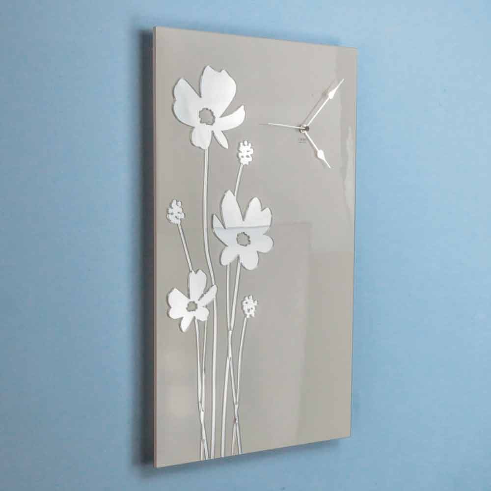 Modern design rectangular wall clock in white wood with mirrored plexiglass inlays, made in Italy.