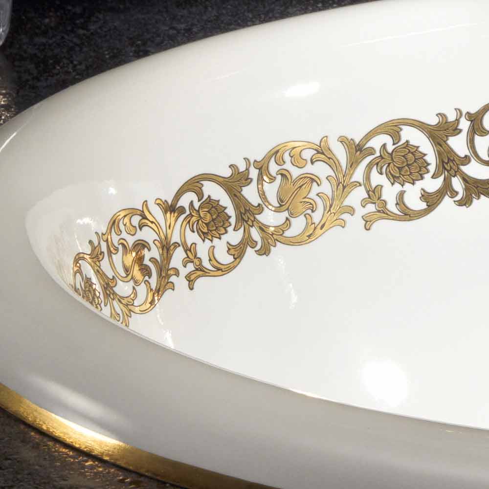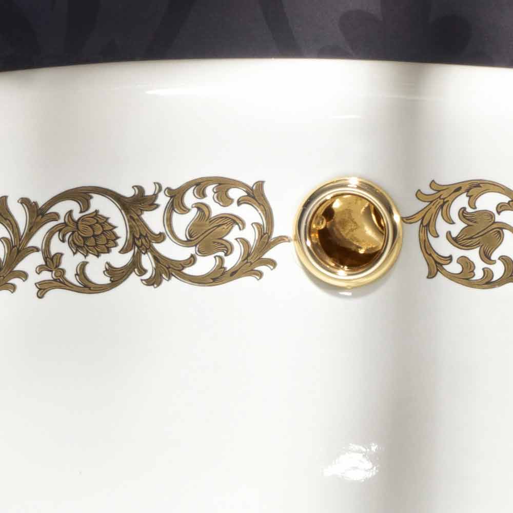 Built-in bathroom washbasin made in Italy in hand-crafted fire clay decorated with a gold pine cone band and 24 carat gold edge.