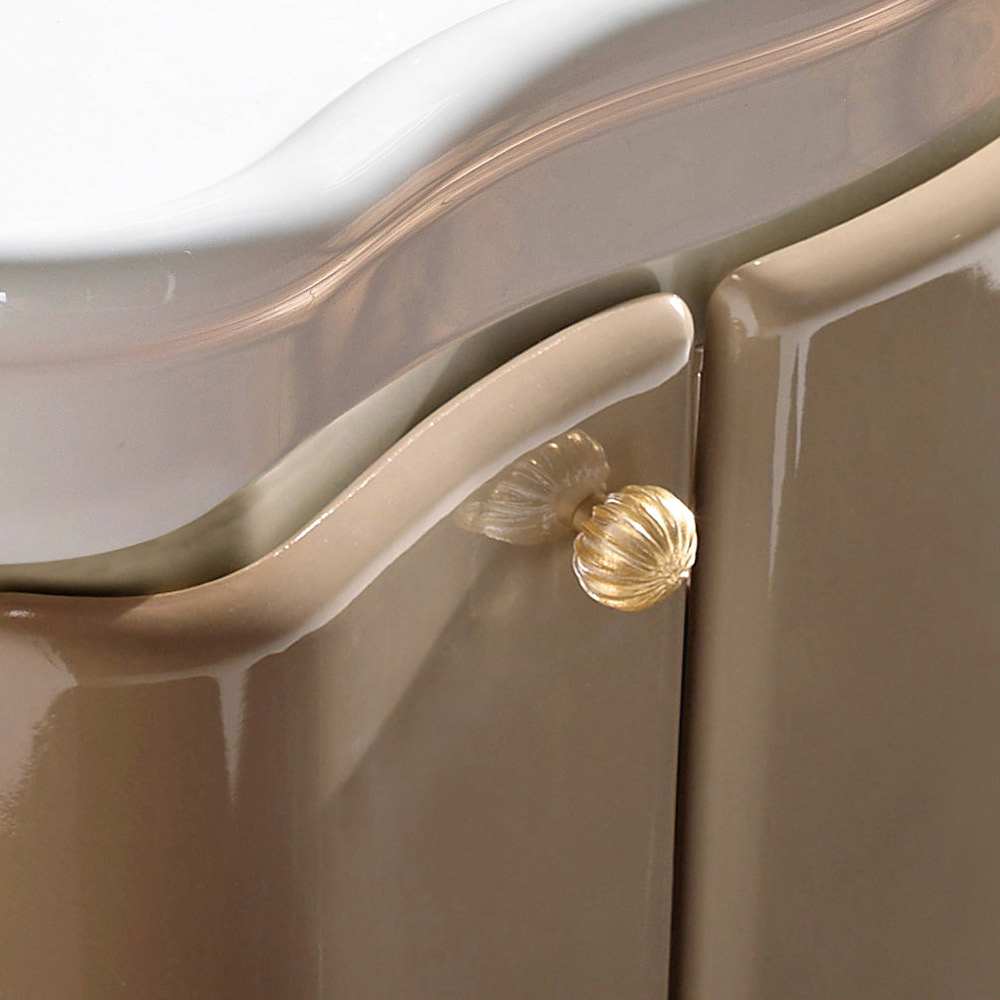 Bathroom cabinet in MDF with two doors and a two-tone caramel glossy lacquered drawer with ivory structure , with white ceramic sink . Brass knobs and sink are included.