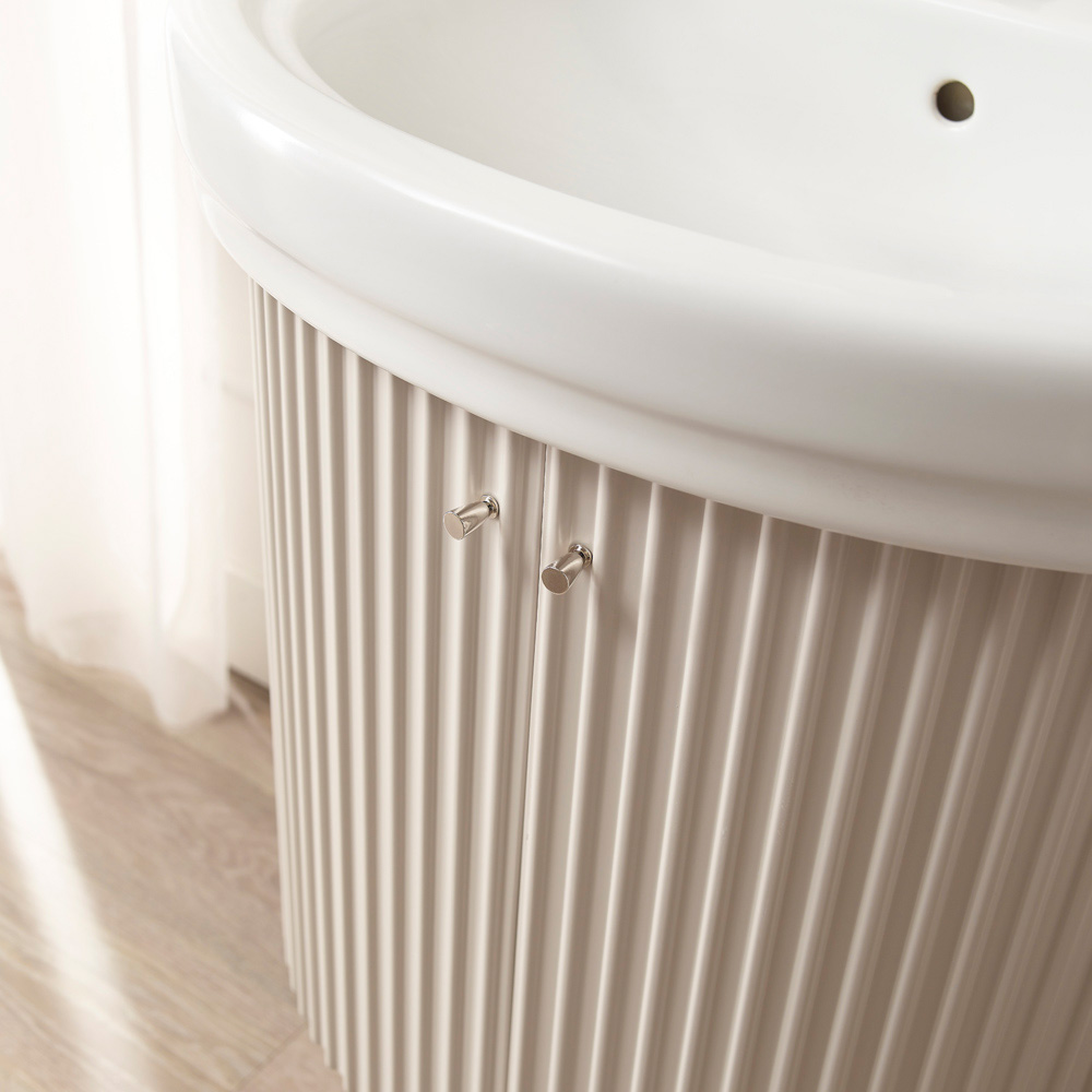 Bathroom cabinet in MDF with two doors with cannetté workmanship , matt finish, one shelf in MDF Idro, complete with ceramic sink and nickel knobs included with matt white MDF legs .