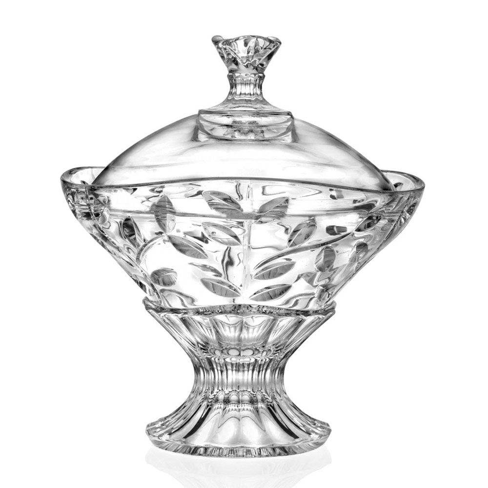 Centerpiece and bowl for sweets with lid in eco-crystal decorated with leaf, 2 pieces made in Italy.