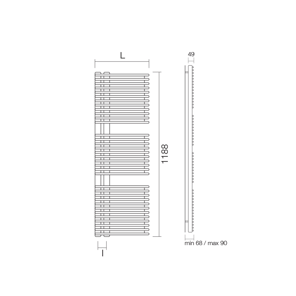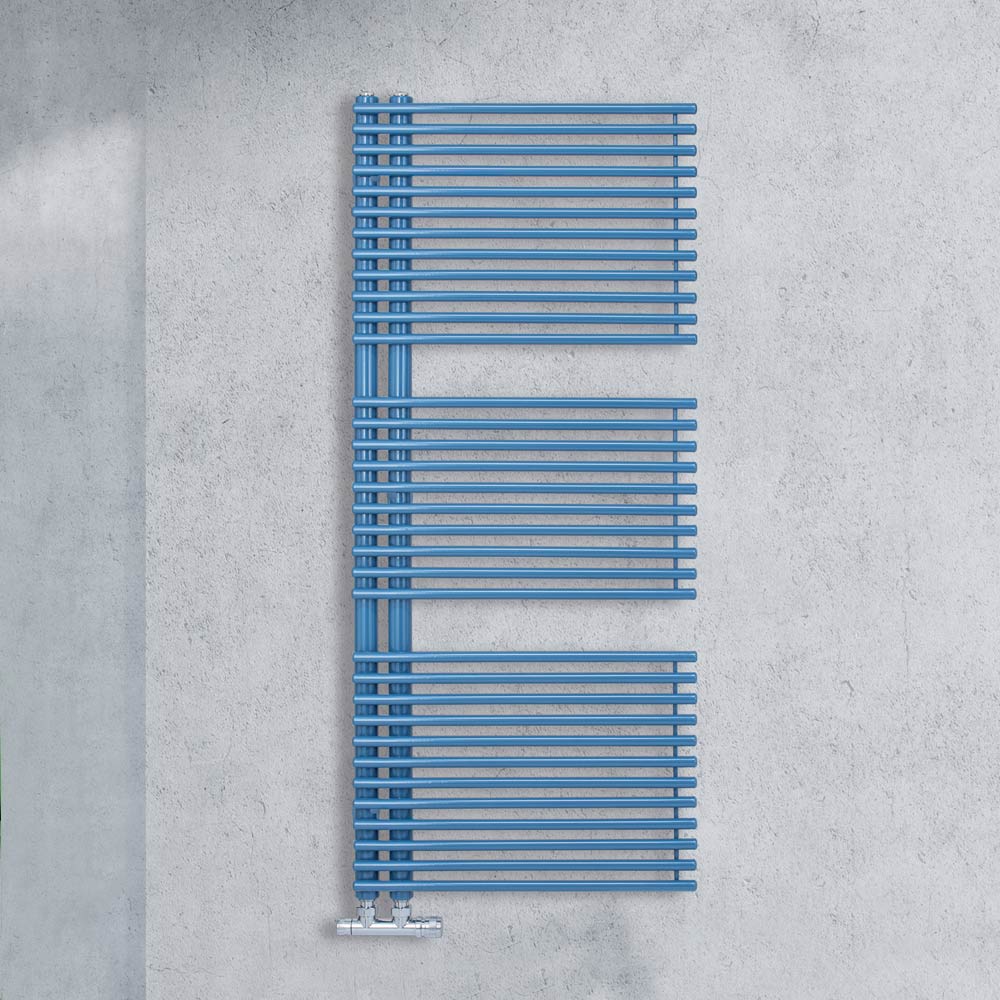 Hybrid towel warmer in carbon steel with BGPS finish consisting of a series of horizontal elements with a diameter of 1.6 cm welded onto vertical manifolds with a diameter of 3.5 cm. Entirely made in Italy with wall fixing kit, vent valve and blind plug included .