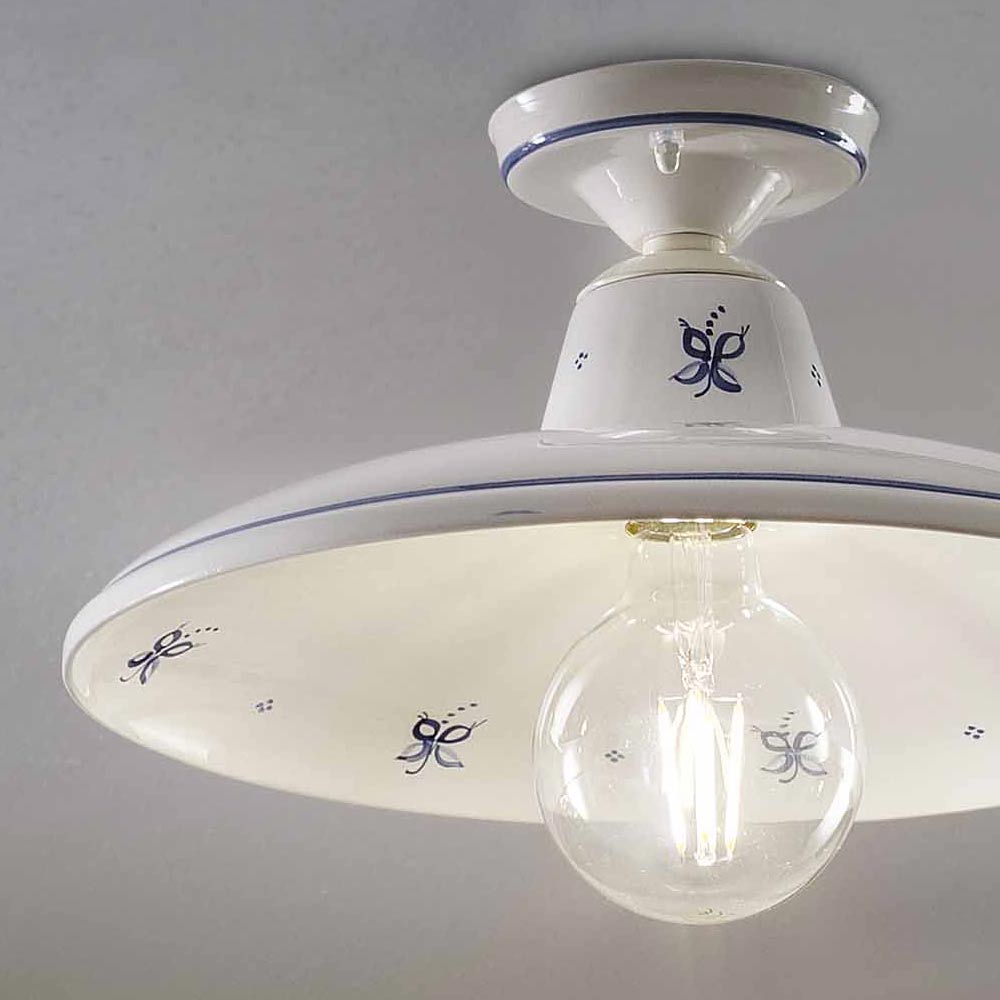 Hand-decorated iron and ceramic ceiling lamp, made in Italy by Ferroluce.