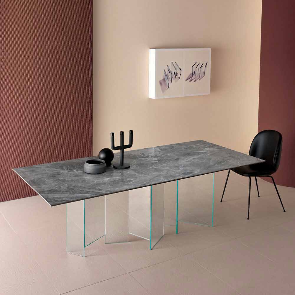 Modern design table with ceramic top and extra-clear glass base, made in Italy.