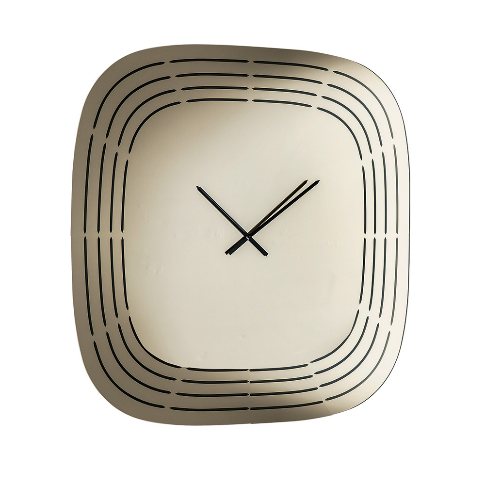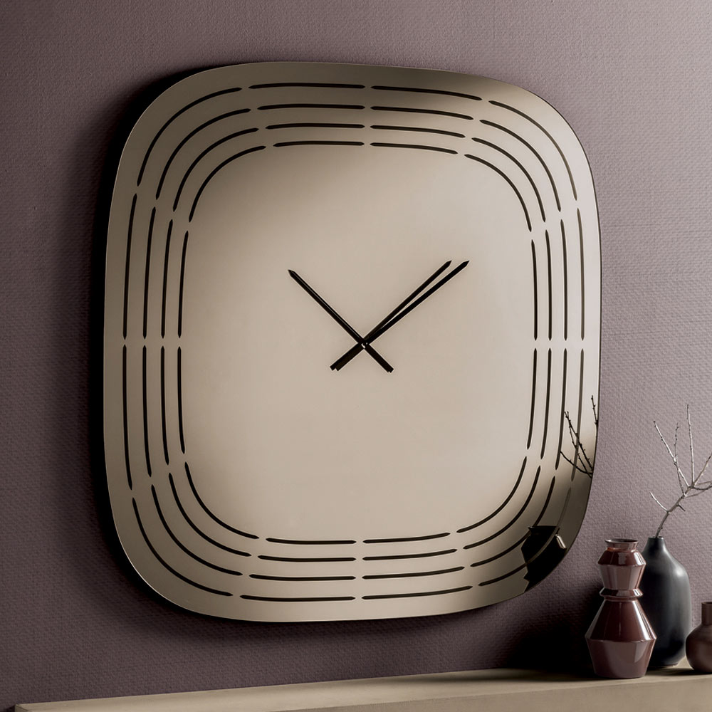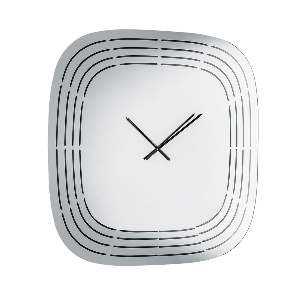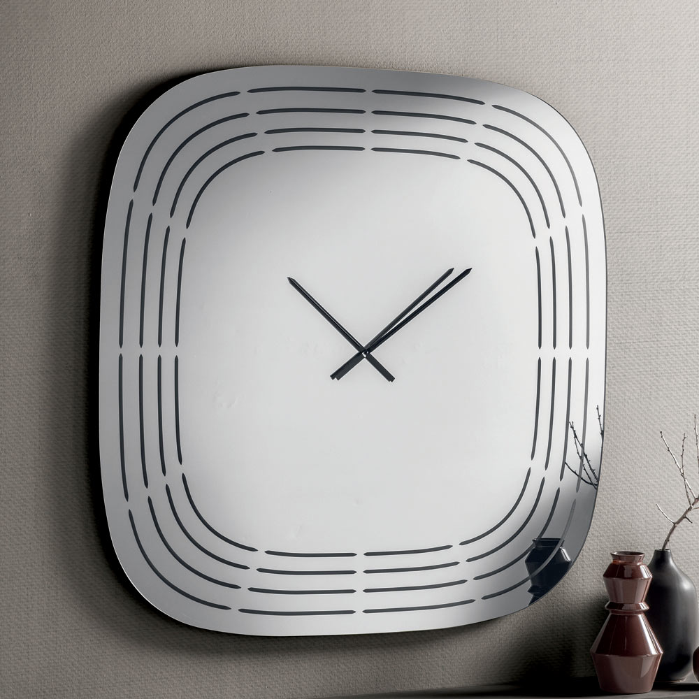 Crafted from mirrored glass , the clock features a square shape with rounded corners that soften its appearance, making it visually balanced and modern. The surface is embellished with laser engravings that draw concentric lines following the profile of the clock, leaving space in the center for the hands and creating a refined graphic effect.