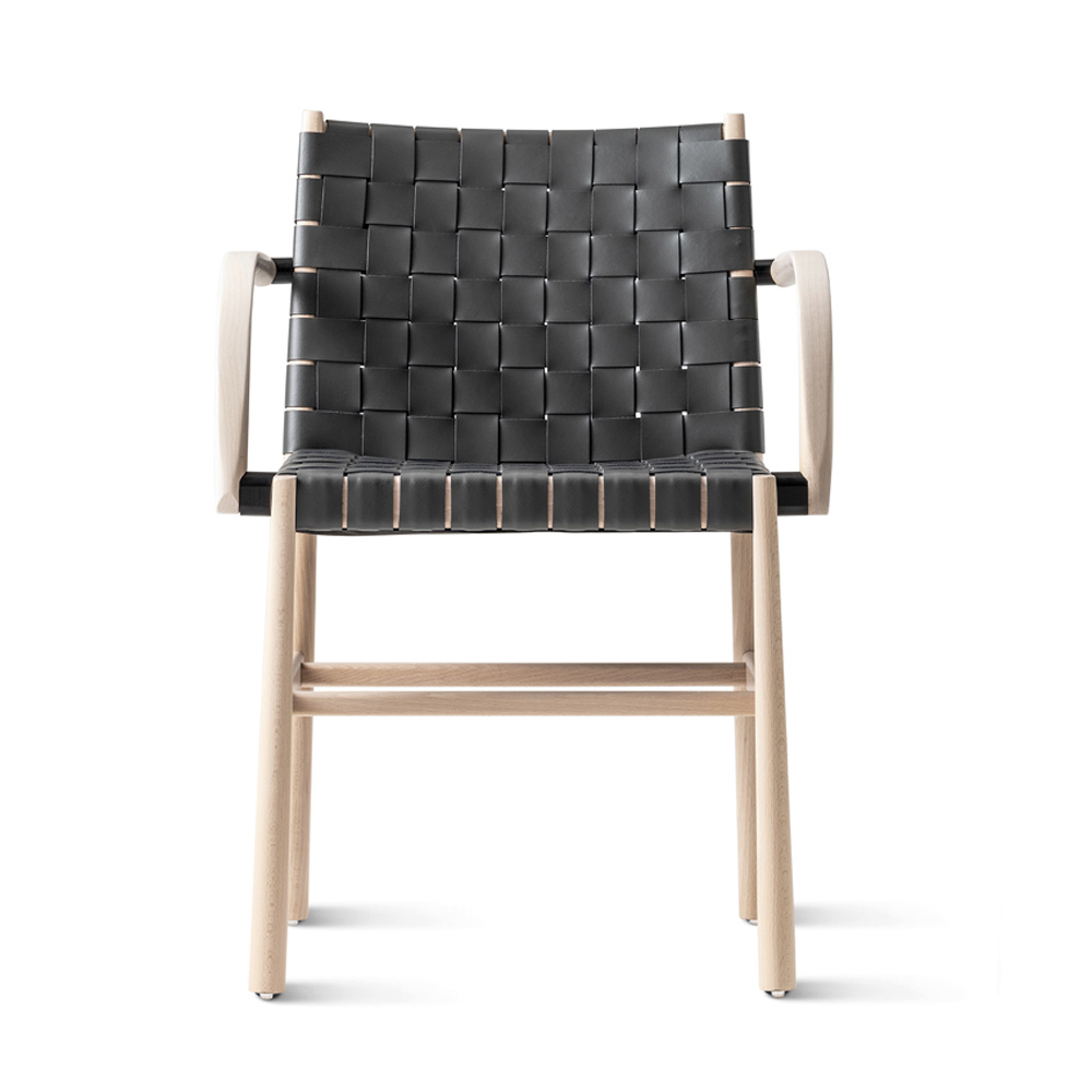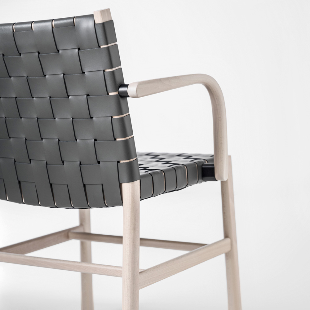 Modern chair with armrests made in Italy with structure in bleached beech wood and back and seat in woven leather . Tradition and modernity meet and merge to create this innovative design object with an elegant taste able to characterise any environment in an original and creative way . The particular weave of leather that covers the chair makes it extremely fascinating , ideal for enriching and personalizing your spaces with character. Thanks to the wide range of colours available, it is possible to choose between a sober and discreet look or a more colorful and extravagant solution, thus managing to satisfy every need while creating a wonderful harmony with the surrounding furniture.