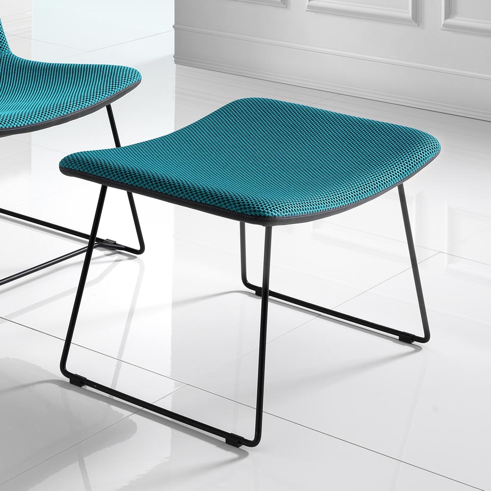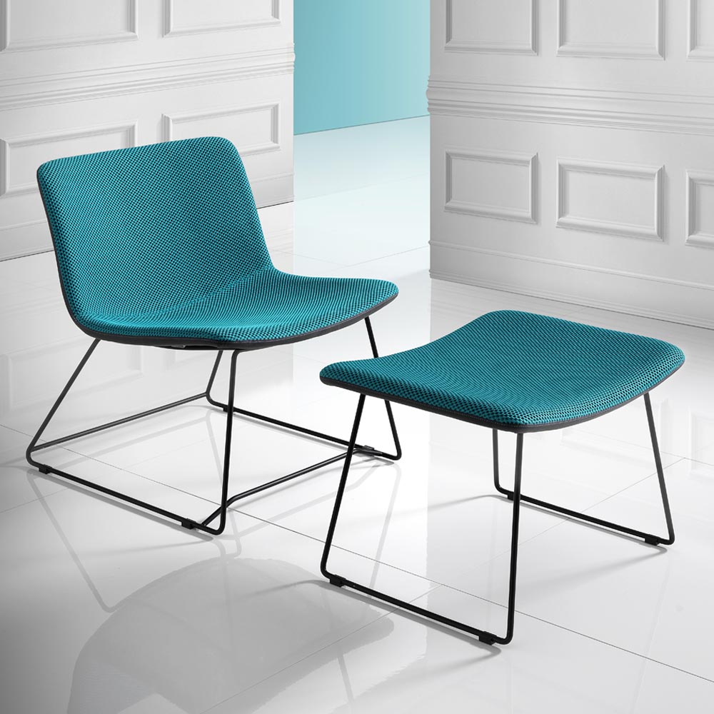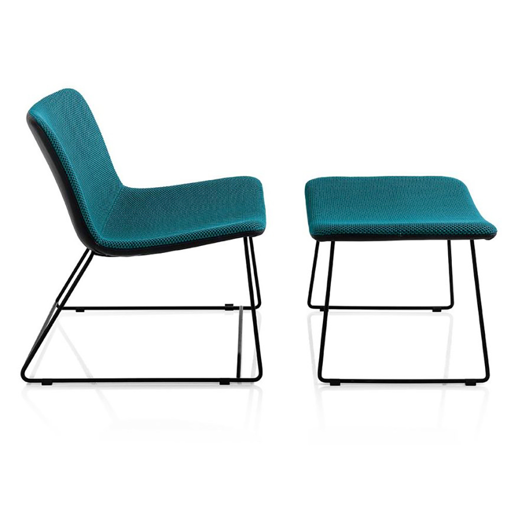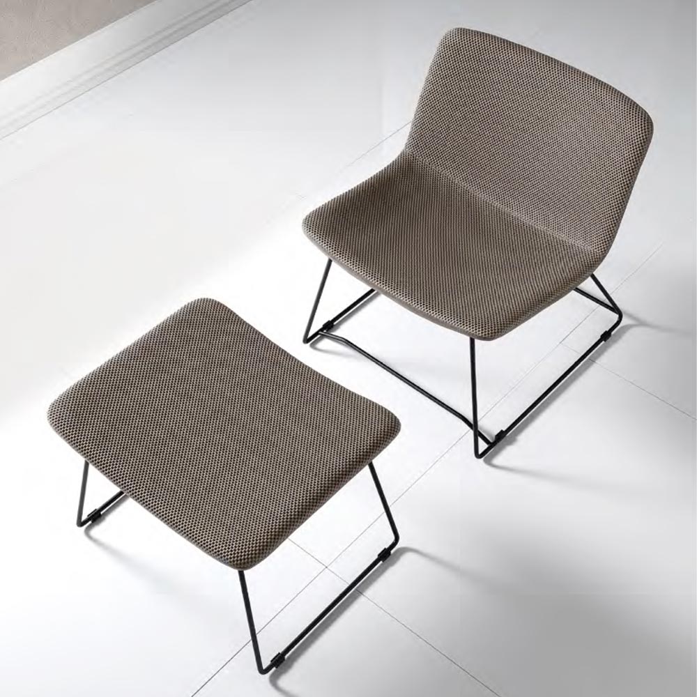 Lounge chair with footrest made with a monocoque seat covered in fabric , base and back covering in black leather-effect fibre fabric and tapered metal legs (diameter 30 mm), entirely Made in Italy.
