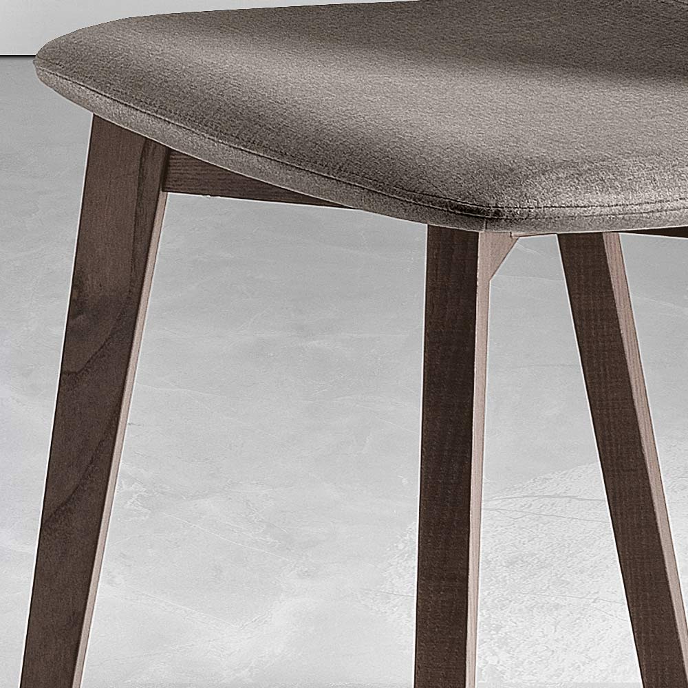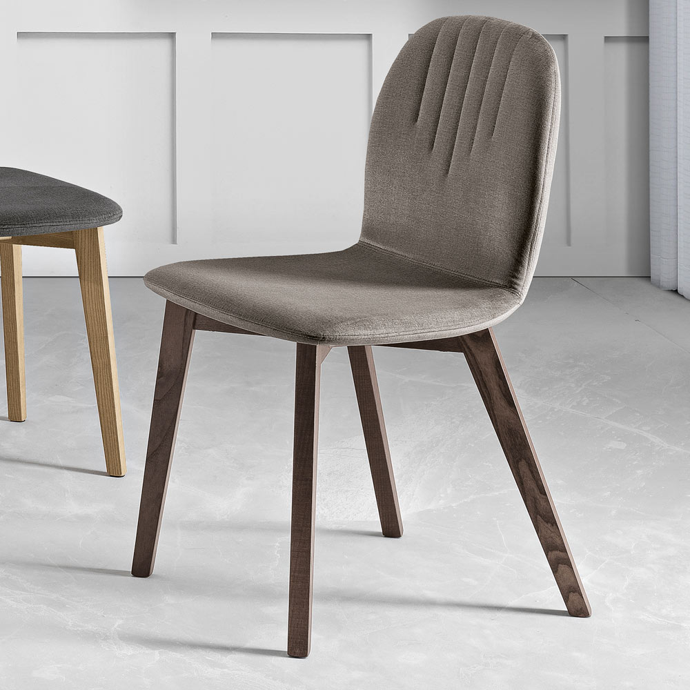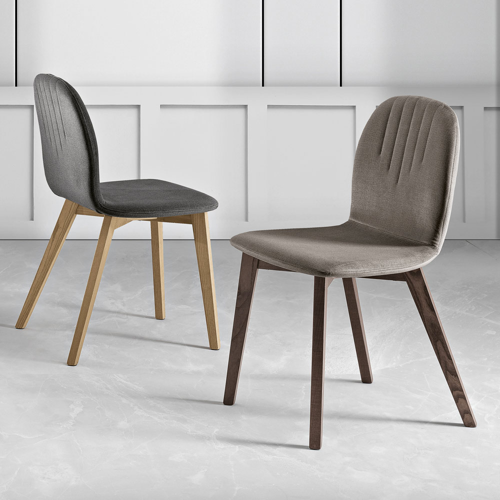 This chair elegantly combines the tone of the wood of its legs with the colour of the fabric seat. The modern, streamlined backrest design, embellished with a delicate linear pattern , adds a touch of class that instantly elevates any dining table or workspace.