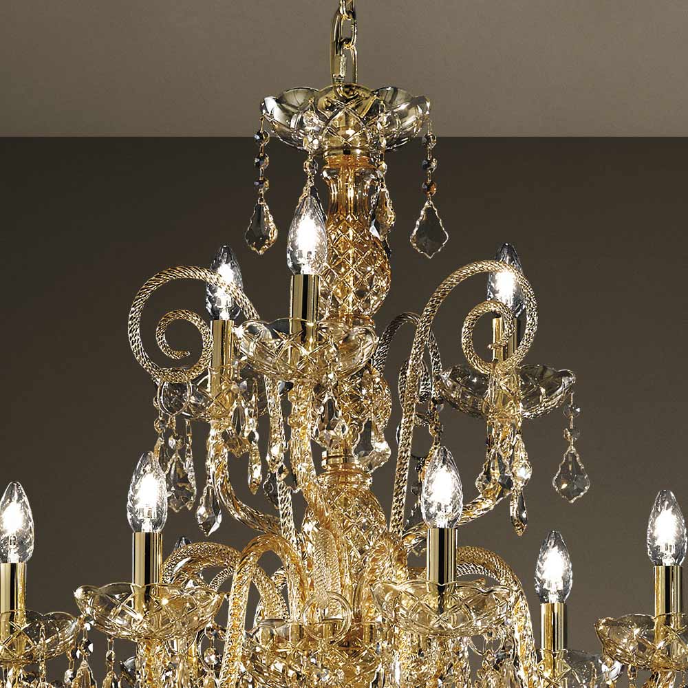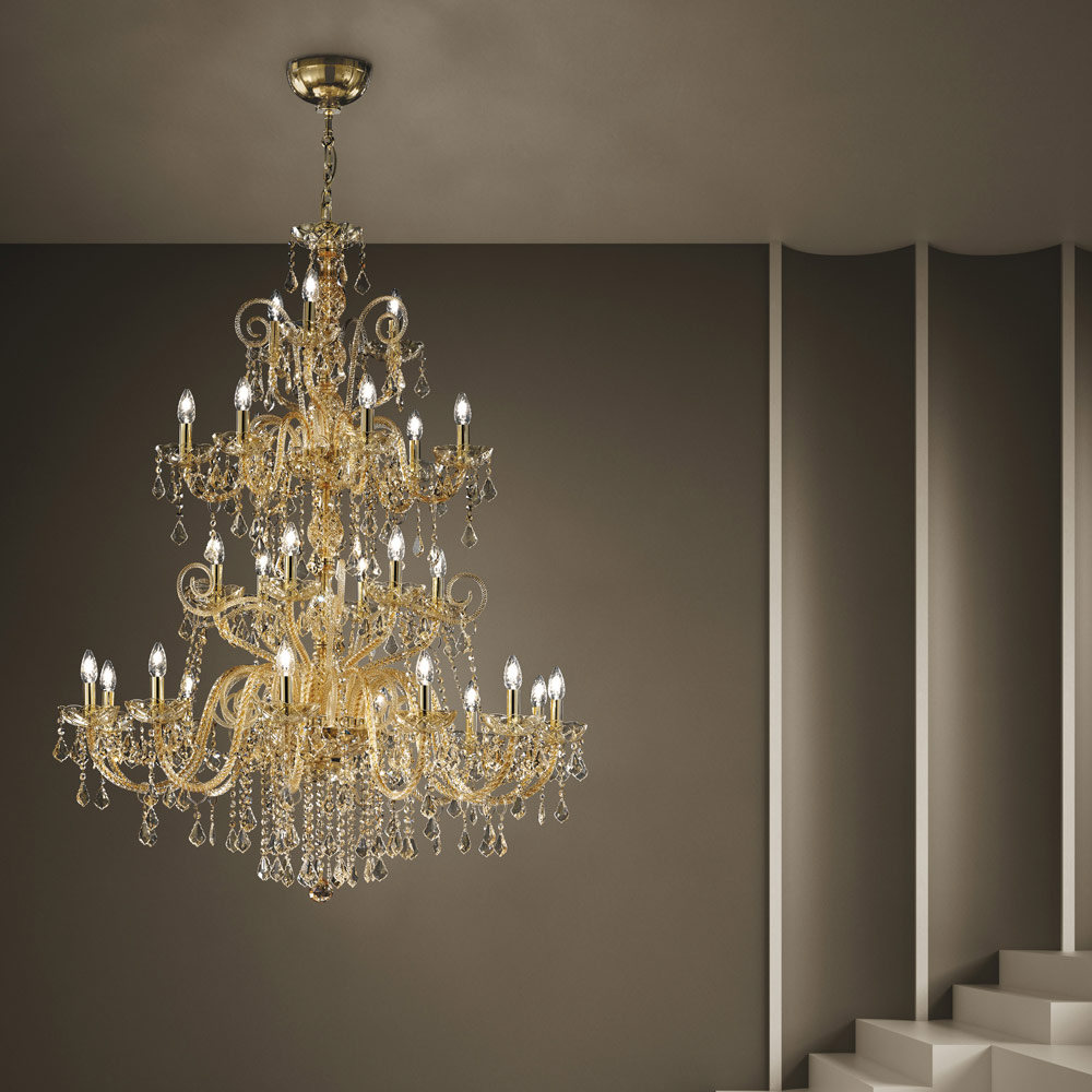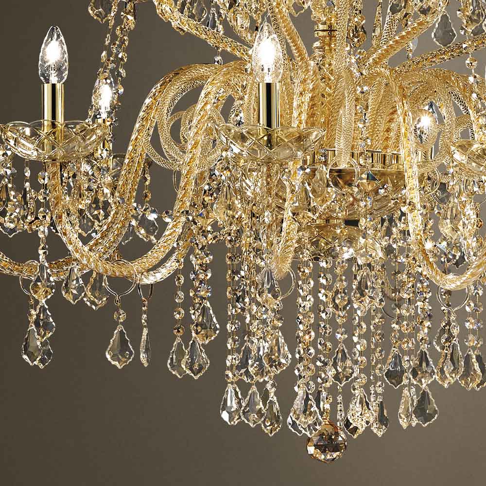 Chandelier with 27 lights made of Venice glass with Amber decoration finish with national pendants Ā and details in shiny golden metal . Made through a craftsmanship , this complement is characterized by the wonderful arms worked by hand through the twisting technique which creates an exclusive result that aesthetically recalls the intertwining of a rope, giving personality to the chandelier. A real rain of light invades the structure of the chandelier and then spreads into the surrounding environment by means of refraction through the magic of sequins and crystal pendants with fine finishes, thus creating an evocative and dreamlike scenographic effect capable of enchanting and surprising. for its elegance and majesty .