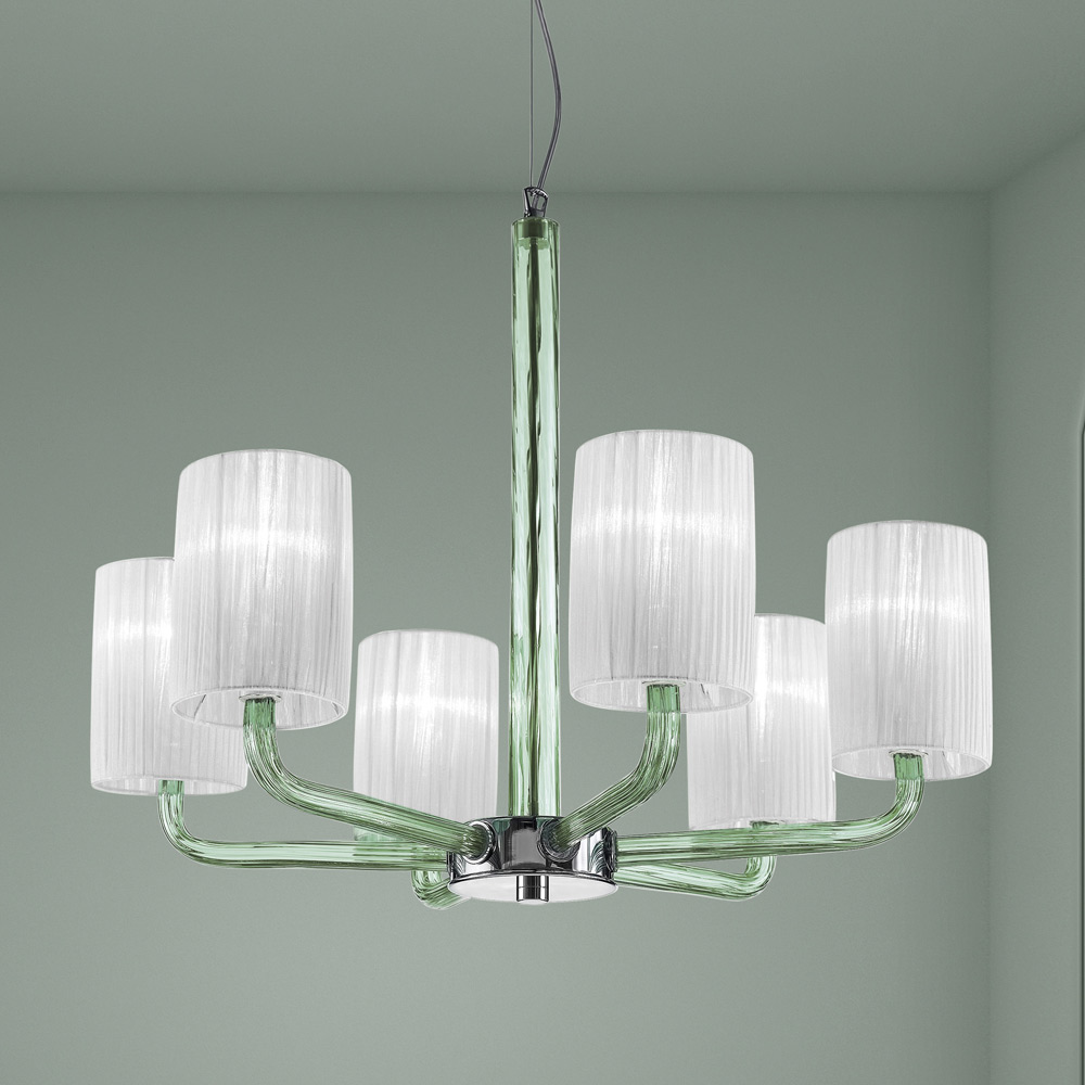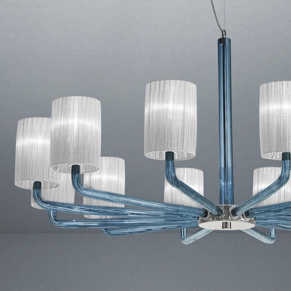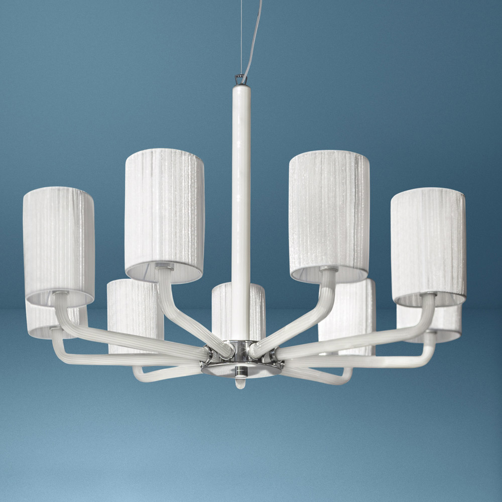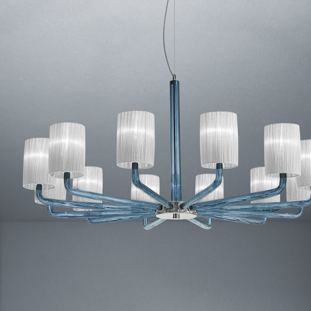strong stage presence typical of the classic chandeliers of the past. The tubular glass arms support in a delicate and classy way the wonderful fabric lampshades which help to carry the light in every direction for a