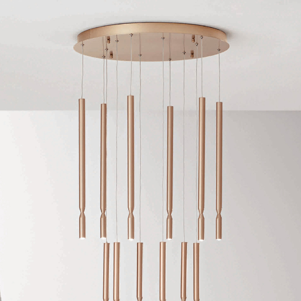 Chandelier entirely produced in Italy made of painted metal with gold finish and 12 dimmable LED lights with adjustable cables in length.
