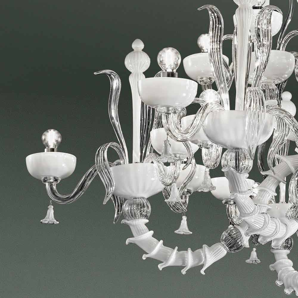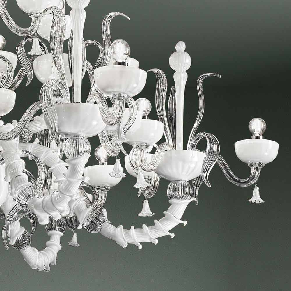 Majestic chandelier with classic queues handcrafted in Venice in crystal and milk white glass with details in polished chrome metal . This wonderful piece of furniture is born from the use of the ancient technique of the covering, whose aesthetics is based on concepts of innovation and recalling the past at the same time. Ideal for giving light to large spaces in the house, this chandelier stands out for its futuristic aesthetic thanks to the wonderful milky white finish that covers the structure. The design is also enriched by the tapered arms embellished with hanging bells completely shaped by hand for a result of high quality and inestimable value .
