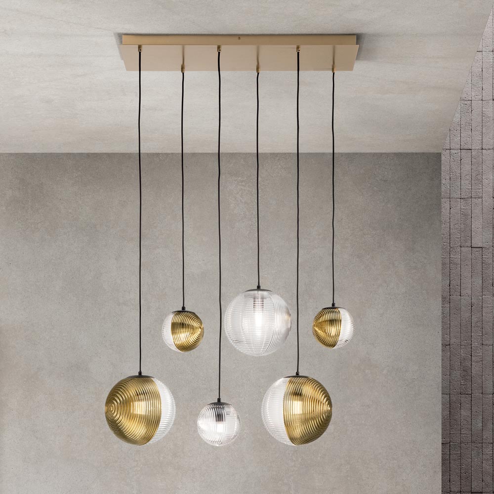 Immerse yourself in an atmosphere of modern elegance with this pendant chandelier, perfect for adding a touch of understated luxury to any space. The luminous spheres hang in a harmonious dance of light and reflections , each encapsulated in blown glass with different finishes, reflecting a warm and welcoming light .