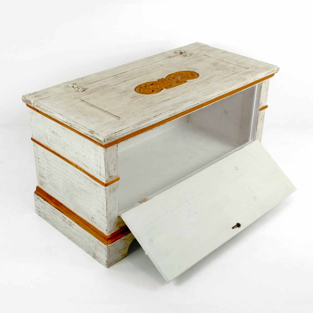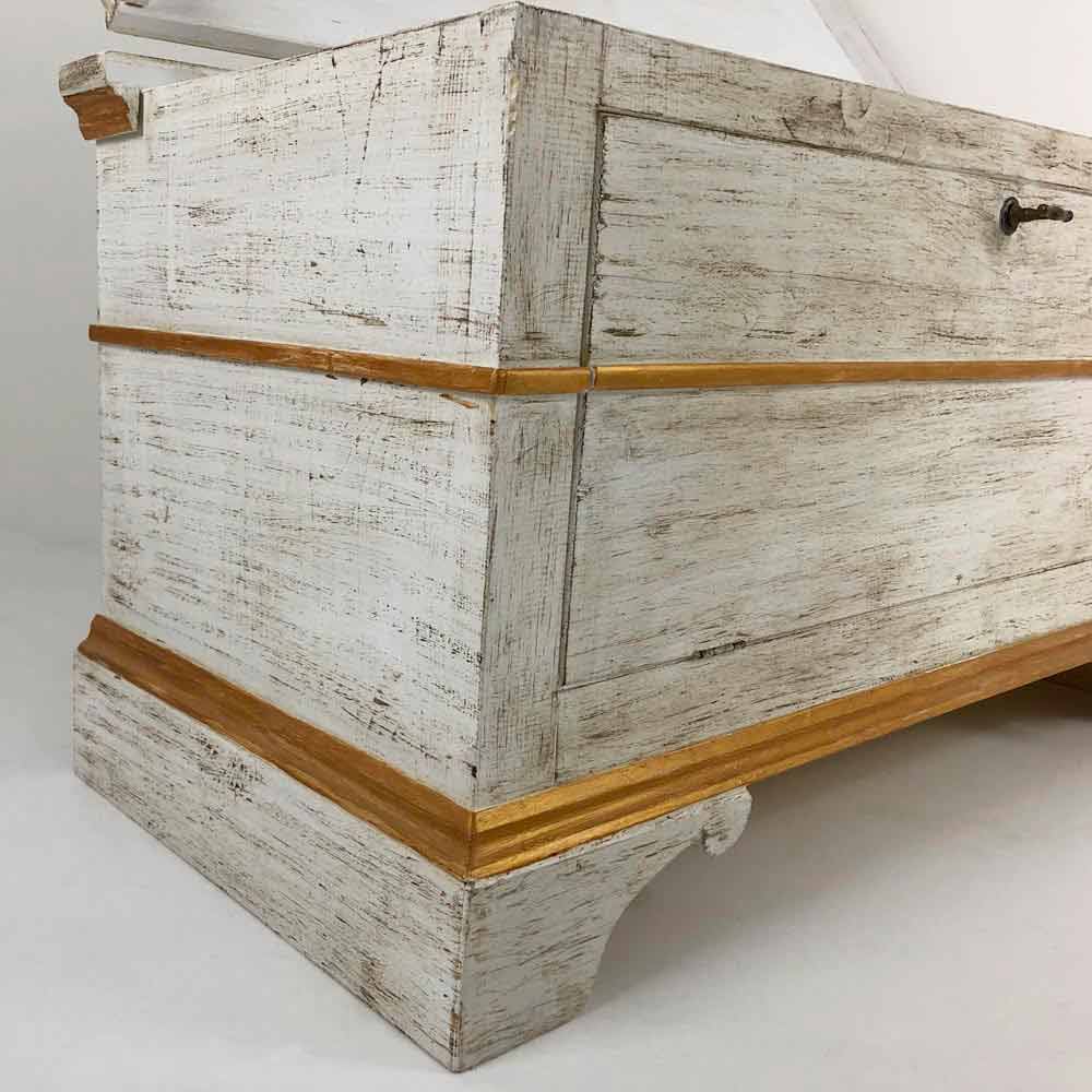 Chest handmade in Italy with structure in solid fir wood with aged white finish, equipped with double opening (top and front) and hand-painted details in antique gold colour. The product is finished with a transparent finish that makes it water-repellent and fixes the colours to make them unchangeable over time.