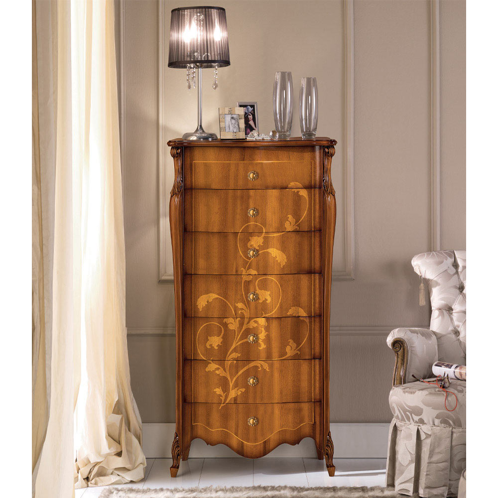 Chest of drawers with a timeless classic style equipped with 7 practical drawers and made of Bassano walnut finish wood with inlays . The chest of drawers is available in two different sizes, to better adapt to every need. A unique and refined complement, completely made in Italy by skilled master craftsmen , masters of art who finish each complement with wisdom and taste for elegance. The production is carried out using fine materials , and performing the work by hand with the utmost care and professionalism that distinguishes Made in Italy products.