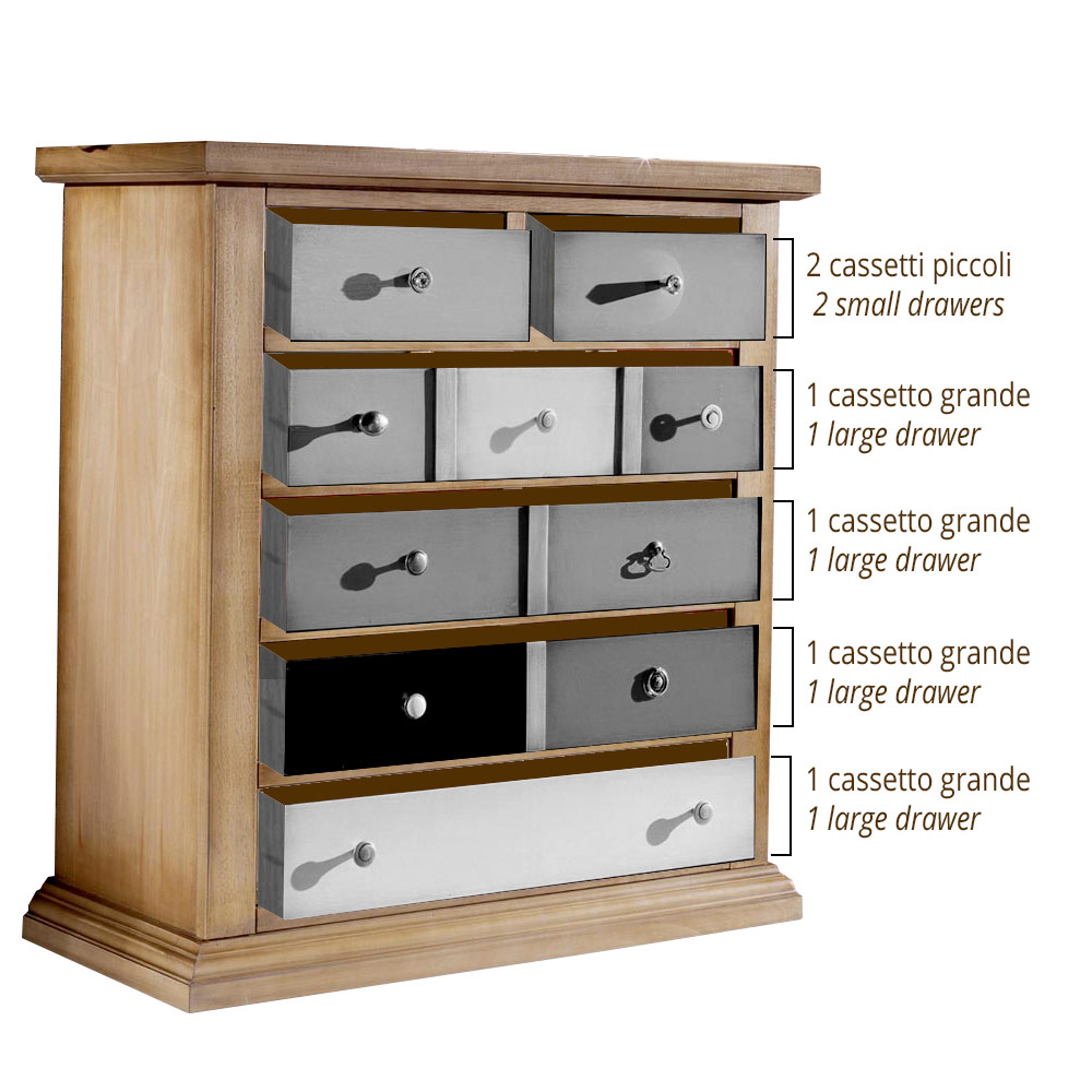 The design of the drawers is purely aesthetic. Starting from the top there are 2 small drawers followed by 4 large ones. Contact us for a quote or for information using the "