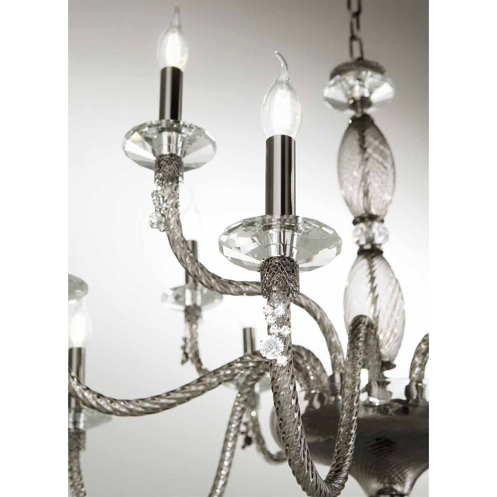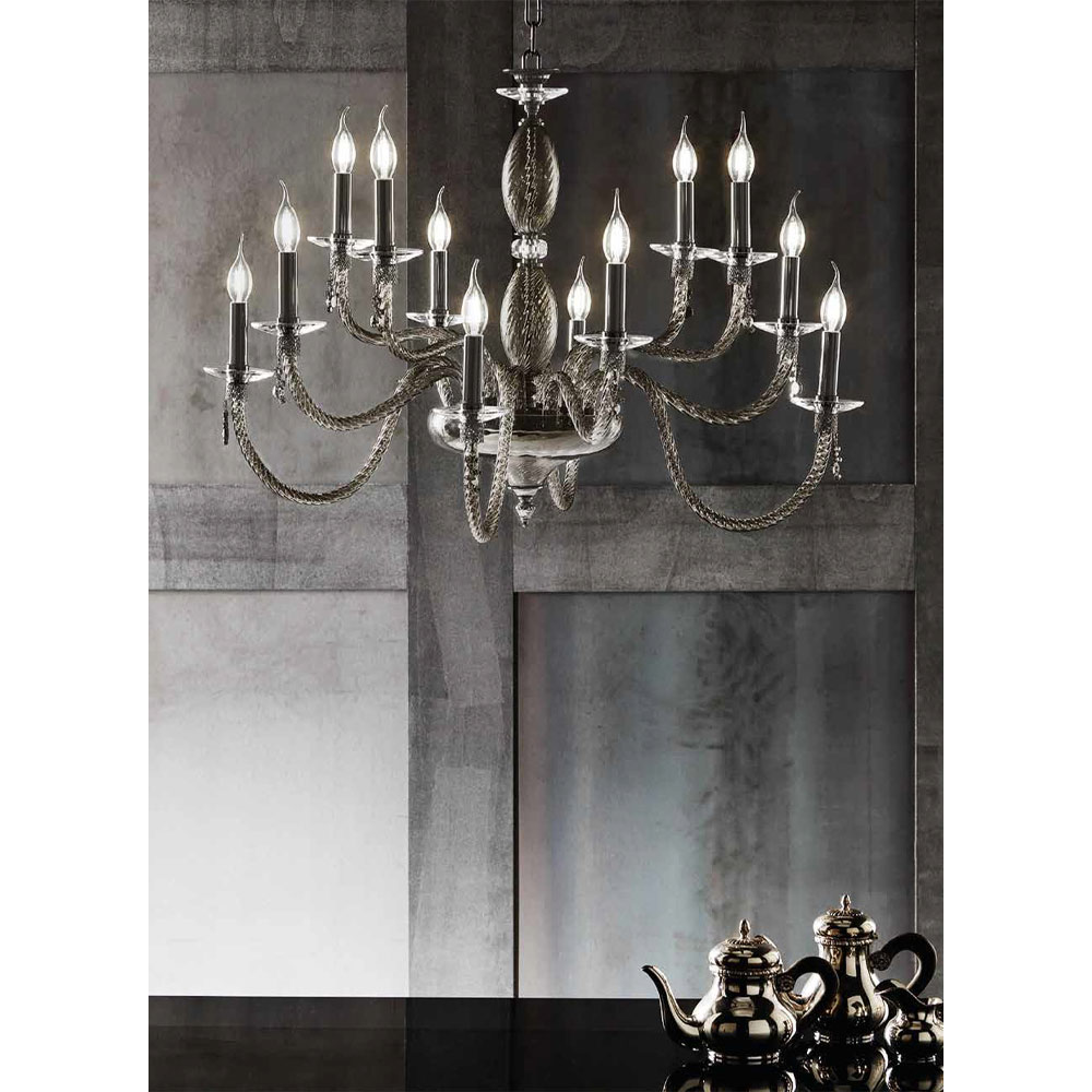 The 12 lights chandelier is a luxury lighting complement entirely made in Italy in handcrafted blown glass of the highest quality with metallic finishes.