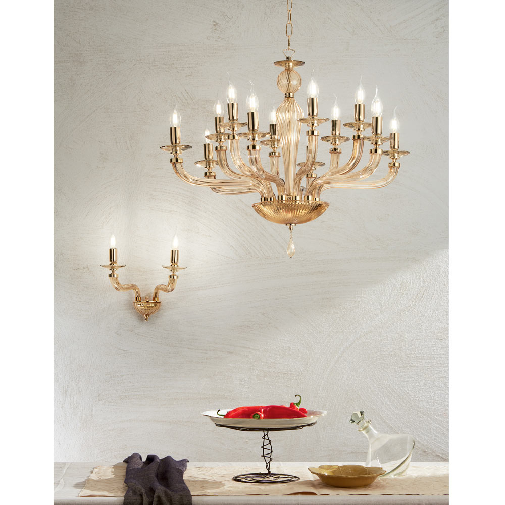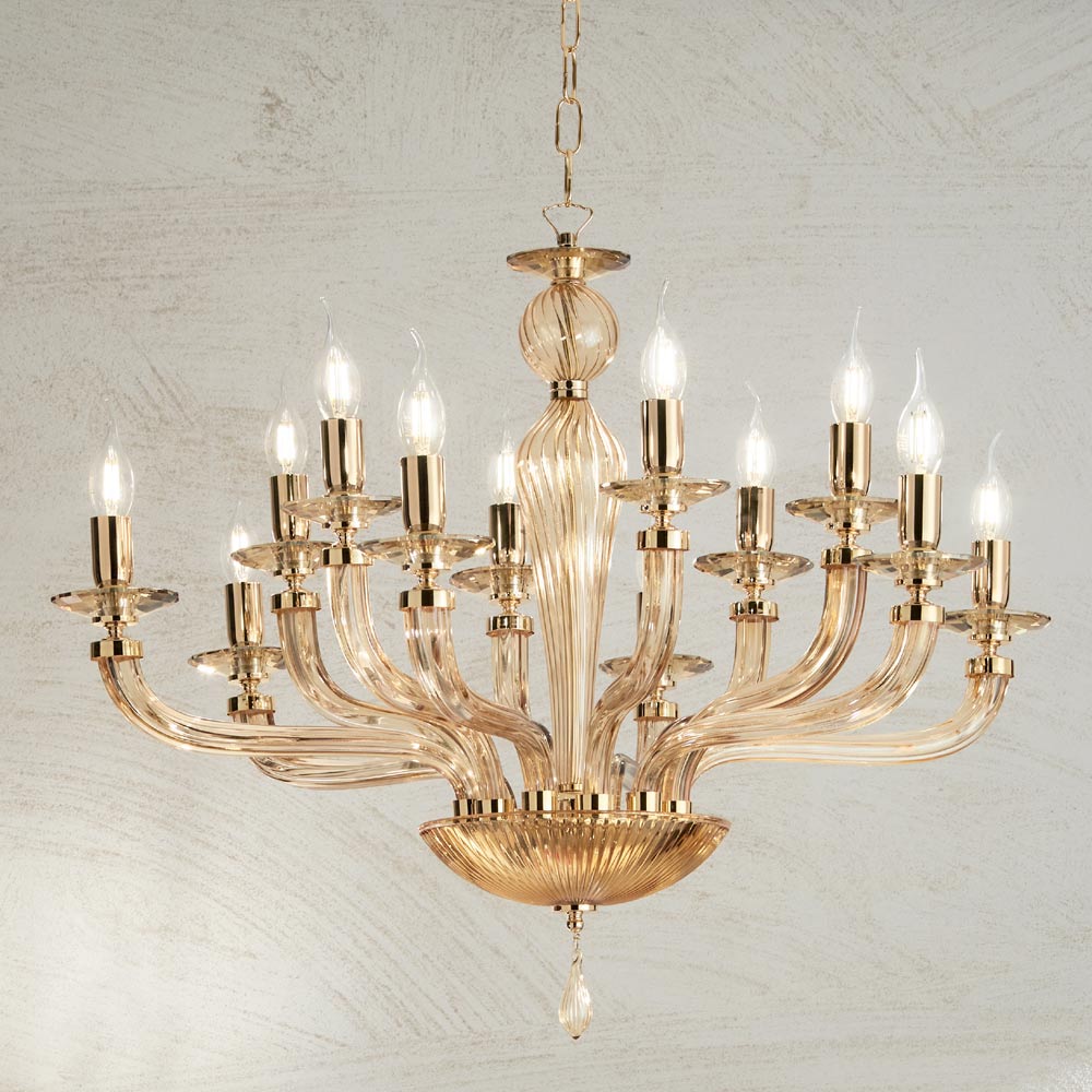 This classic style pendant chandelier is made up of 12 curved arms made of glass handmade in Italy with a "rigaton" effect in amber finish which support the saucers hosting the light sources.