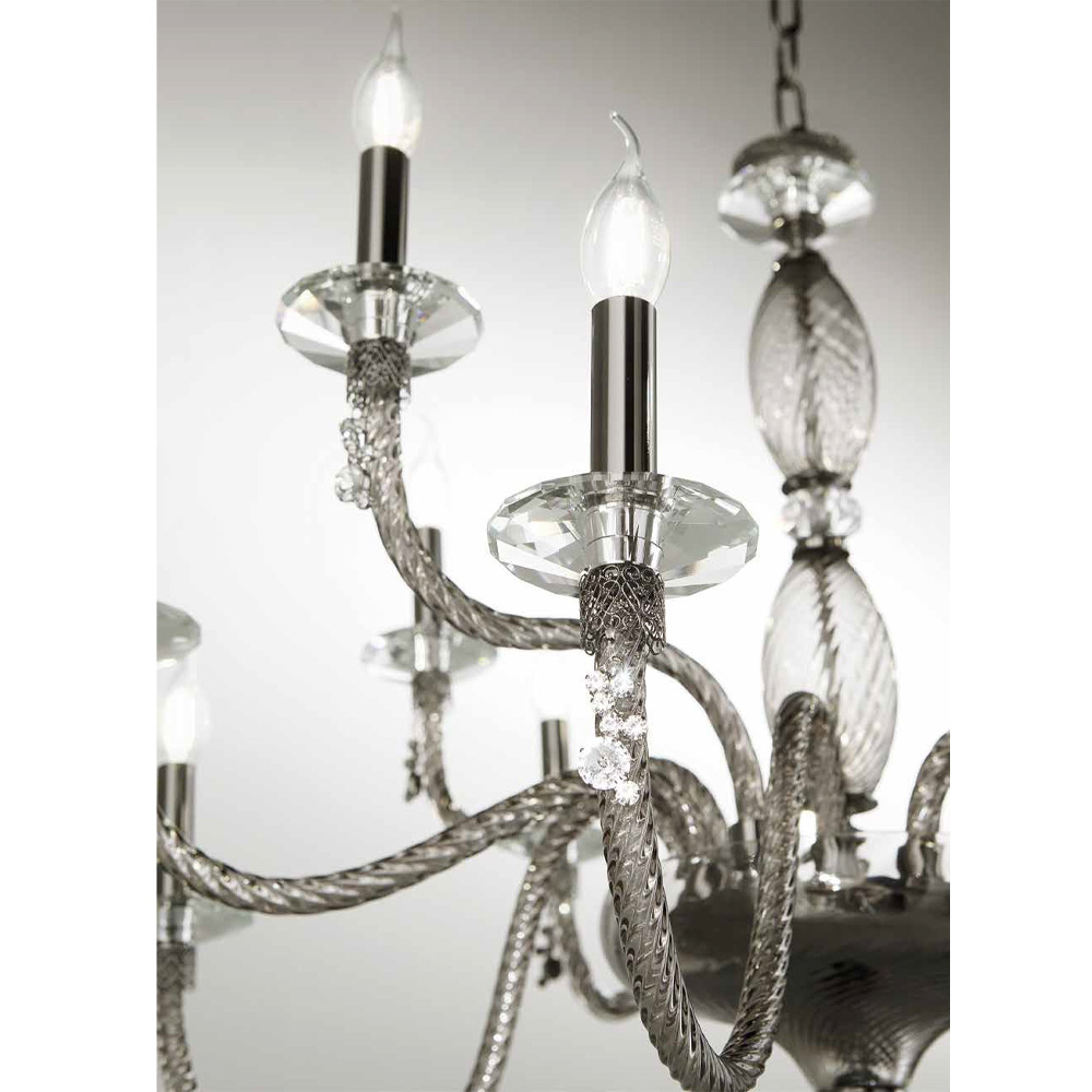 The 18-light chandelier is a luxury lighting accessory entirely made in Italy in hand-blown glass of the highest quality with metallic finishes.