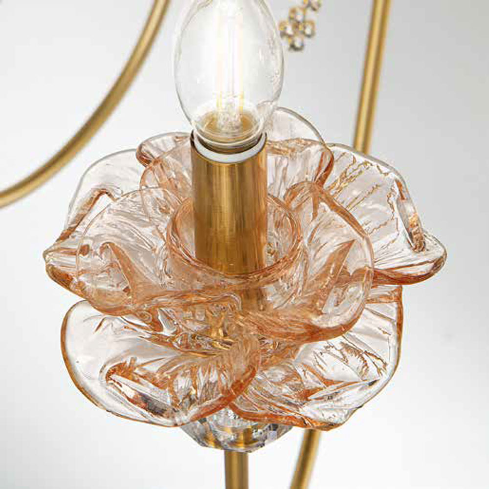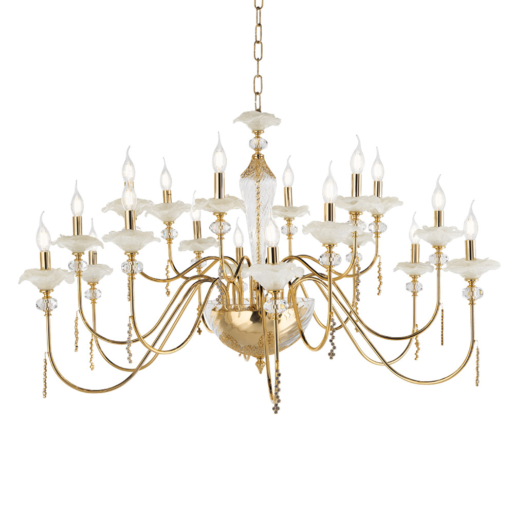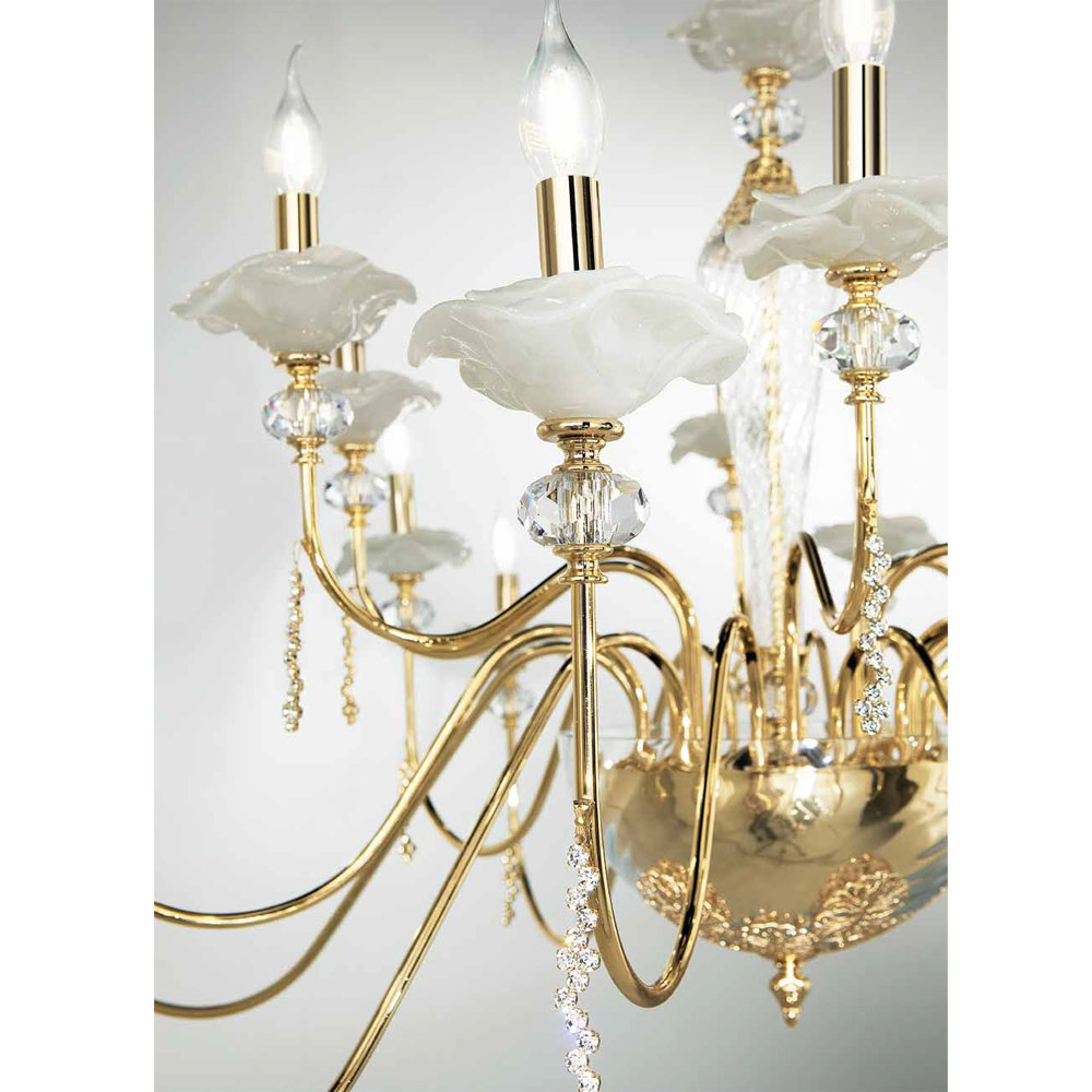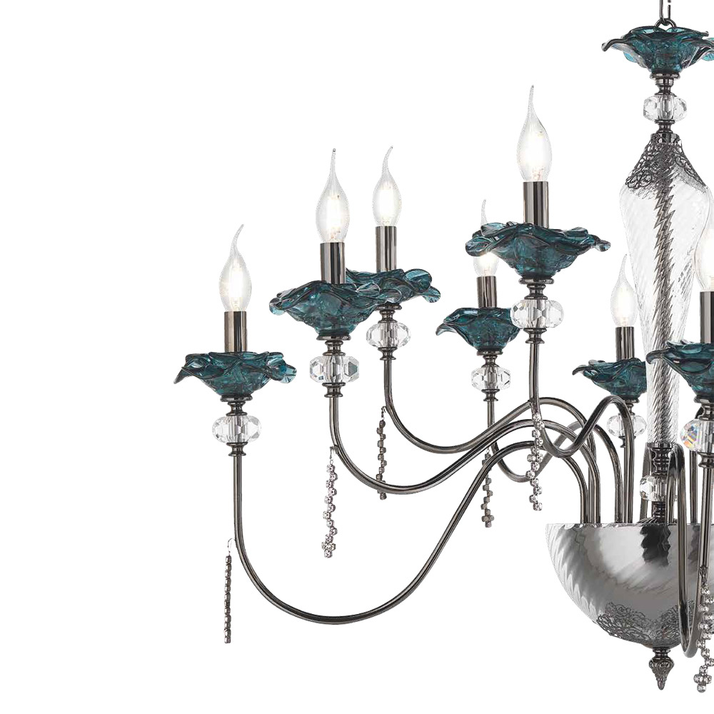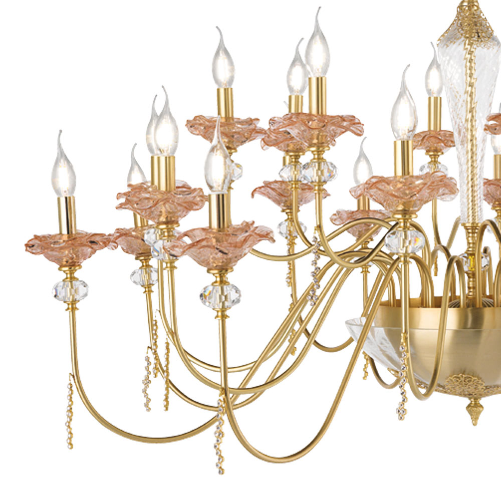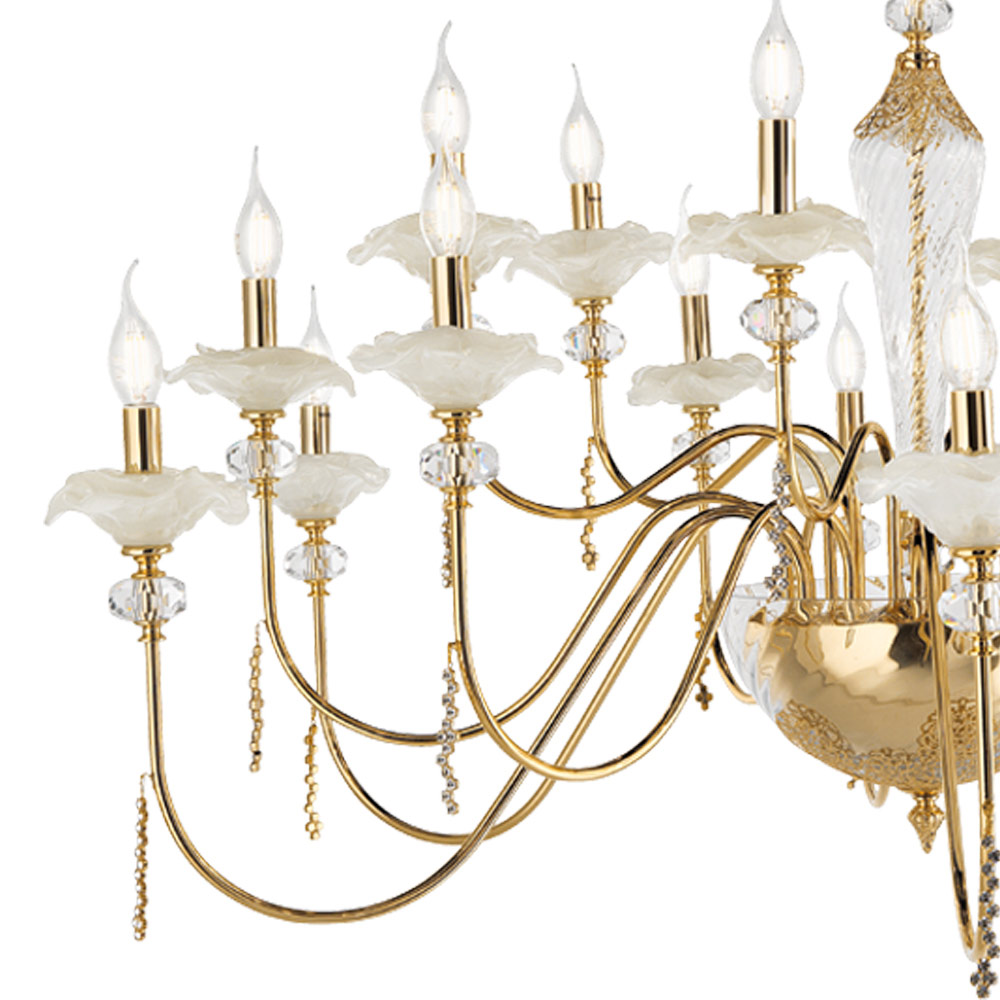 18 lights chandelier in handcrafted glass with buds and crystal drops, luxury made in Italy.