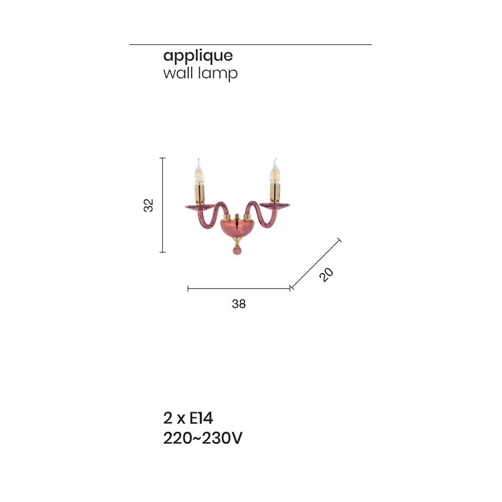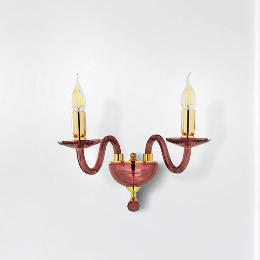 This classic style wall lamp consists of 2 arched arms made of glass handcrafted in Italy in burgundy finish which support the saucers hosting the light sources.